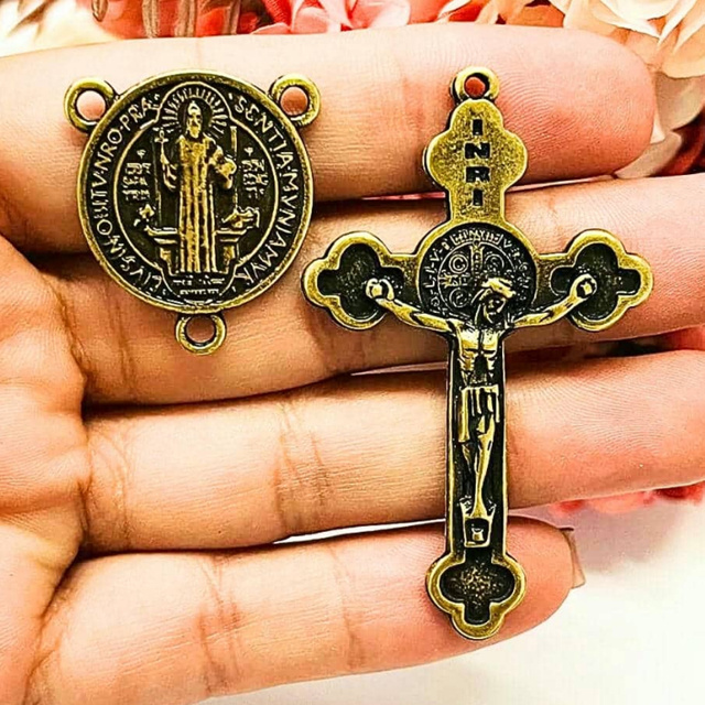 5 Crucifixos + 5 Entremeios São Bento Ouro Velho para Terços São Bento Medalha São Bento