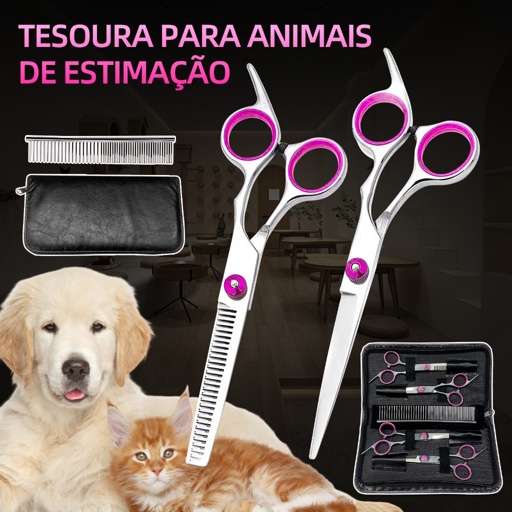 Kit Profissional de Corte e Estilo para Pets: Eleve a tosa do seu pet para o Próximo Nível! Dê ao seu companheiro peludo o tratamento que ele merece com o nosso novo Kit Profissional de Corte e Estilo para Pets. Desenvolvido para atender às necessidades dos amantes de animais, este conjunto exclusivo oferece ferramentas de alta qualidade para um cuidado excepcional com seus animais de estimação. * Tesoura Padrão Para Tosa (17 cm): Perfeita para cortes precisos e detalhados, garantindo um acabamento impecável e elegante. * Tesoura para Desbaste (17 cm): Projetada para criar camadas suaves e naturais, proporcionando um visual profissional e confortável para o seu pet. * Tesoura Curva (17 cm): Ideal para áreas delicadas e curvas, permitindo um corte preciso em regiões mais difíceis. * Escova de Qualidade Premium (19 cm): Com cerdas suaves e resistentes, esta escova ajuda a manter a pelagem do seu animal macia, brilhante e livre de nós, com diferentes espaçamentos entre os dentes para atender dos pelos mais finos aos mais volumosos. * Pano de limpeza * Cor: Prata c/Azul e Prata c/Rosa Recursos e Benefícios: Alta Qualidade: Tesouras afiadas e duráveis, projetadas para durar e resistir ao uso frequente. Versatilidade: Adequado para todos os tipos de pelagem, proporcionando resultados excepcionais em diversas raças. Conforto: Cabos ergonômicos garantem uma experiência de tosa confortável tanto para você quanto para o seu pet. Estilo Profissional em Casa: Economize tempo e dinheiro com este conjunto completo, permitindo que você mantenha a pelagem do seu animal de estimação no conforto da sua casa.