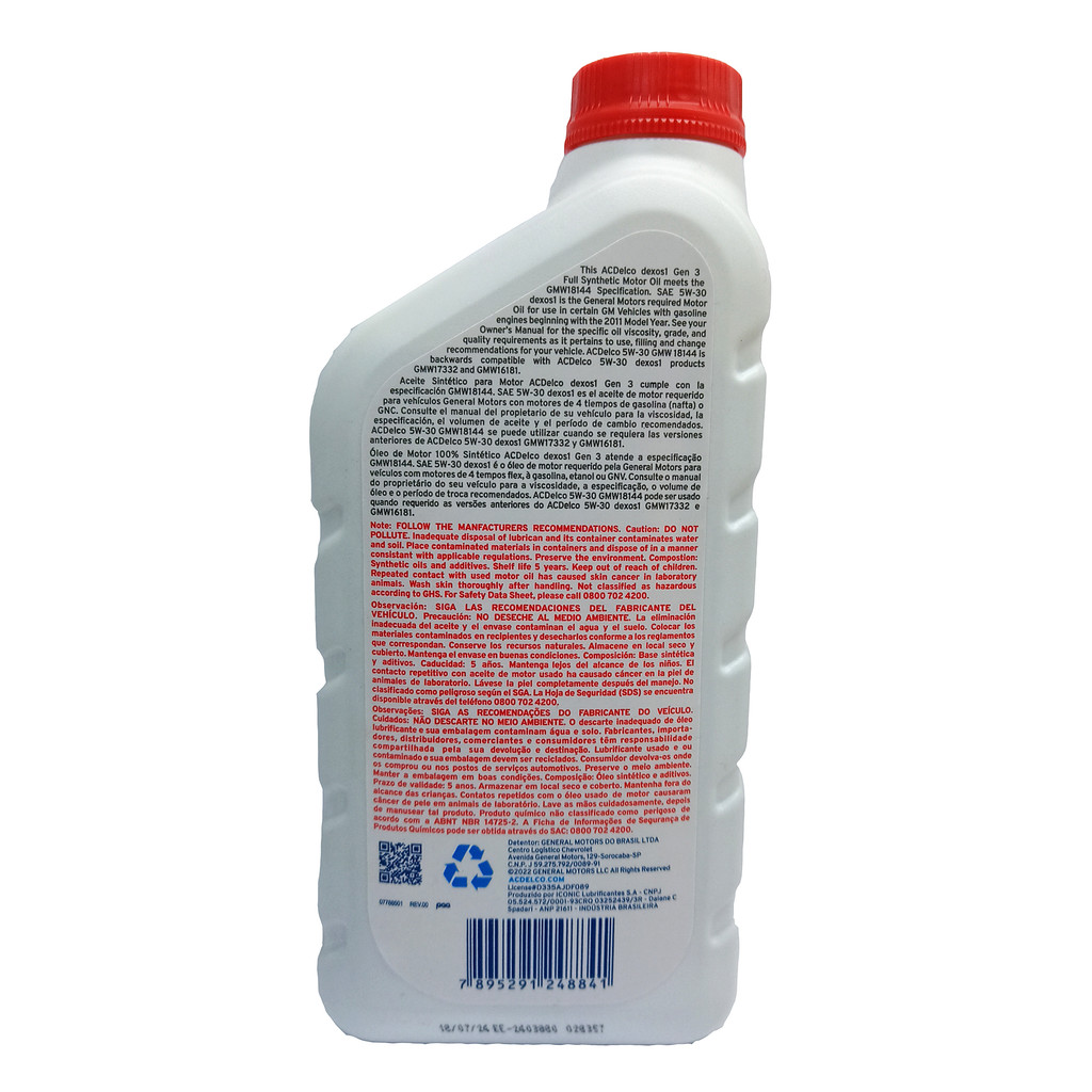 5 Litros Óleo 5W30 Sintético ACDelco 98553886 LOJA DPC DISTRIBUIDORA DE PEÇAS CAPIVARI LTDA Somos uma empresa qualificada operando a mais de 35 anos no ramo de autopeças linha leve. Trabalhamos com grande variedade de peças automotivas, utilize o campo de perguntas para cotação! 5l Óleo 5W30 Sintético ACDelco Codigo: 5x 98553886 Marca: ACDelco SAE 5W30 API SN DEXOS 1 GEN 3 Cada Frasco contém 1 Litro. Anuncio referente a 5 Frascos. Produto novo, com garantia e nota fiscal. RECOMENDAÇÕES: - Prazo de Garantia é de 90 dias para defeitos de fabricação do produto. - A garantia expira caso seja feito um mau uso do produto ou pela má instalação, por isso recomendamos sempre que a instalação seja feita por um profissional especializado. - As fotos de nossos produtos são reais, para maior segurança para o consumidor. - Antes de efetuar a compra tire todas suas dúvidas no campo perguntas. - Mantenha seus dados e endereços atualizados - Temos carrinho de compras, adicione varios produtos e economize no Frete. - Consulte condicoes especiais para compra de mais unidades, kits ou combos. - Aceitamos devoluções apenas com a embalagem Original e Nota Fiscal. - Atendimento de segunda a sexta das 8h00 as 18h00
