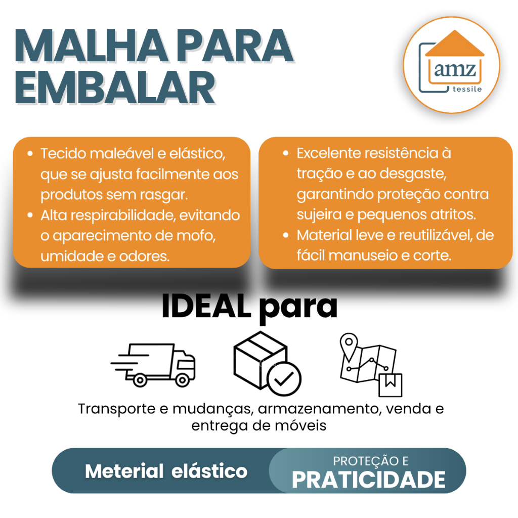 5 Metros de Malha para Embalar Sofás e Colchões – Abertura Ampla A solução ideal para proteger seus móveis durante mudanças, transportes ou armazenamento. Com 5 metros de comprimento e 0,90 metro de largura, esta malha é perfeita para embalar sofás, colchões, cadeiras e outros itens, garantindo proteção contra sujeira, poeira e pequenos danos. Fabricada pela AMZ Tessile, é composta por 100% poliéster, o que proporciona resistência, leveza e praticidade no manuseio. Sua abertura ampla facilita o processo de embalagem, tornando-o mais rápido e eficiente. Características: Medidas: 5 metros de comprimento x 0,90 metro de largura Composição: 100% poliéster Leve, resistente e fácil de utilizar Ideal para proteger móveis em mudanças e armazenamentos Abertura ampla para maior praticidade Observações: Não lavar em máquina Não utilizar secadora Não passar a ferro Proteja seus móveis com qualidade e eficiência. Praticidade e segurança ao seu alcance com a malha para embalar da AMZ Tessile.