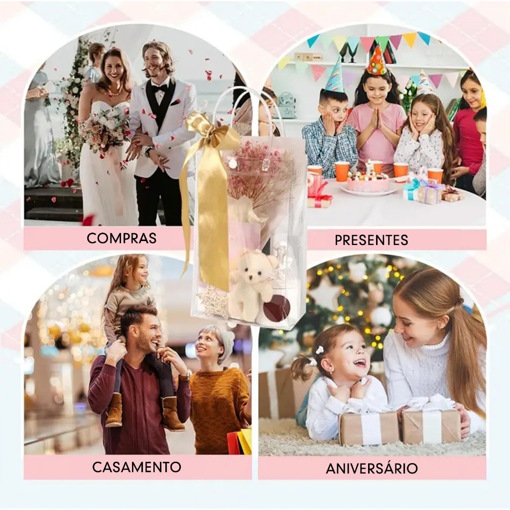# 10 Unidades De Sacolas Transparentes De PVC Para Presente **Sacolas para lembranças de festas de fim de ano, casamento e eventos especiais** ### Descrição do Produto Apresentamos o conjunto com 10 unidades de sacolas transparentes de PVC, ideais para embalar presentes, lembrancinhas e brindes em festas de fim de ano, casamentos, aniversários e outros eventos especiais. Estas sacolas combinam praticidade, elegância e durabilidade, proporcionando um toque sofisticado à sua apresentação. Feitas em PVC de alta qualidade, são resistentes à água e fáceis de limpar. O design transparente permite destacar o conteúdo, valorizando ainda mais o presente. As alças flexíveis facilitam o transporte com conforto, e o fechamento em botão de pressão garante segurança para os itens internos. ### Dimensões Disponíveis (Largura x Altura x Profundidade) - **Modelo Pequeno:** 13cm x 15cm x 7cm Ideal para pequenos itens como doces, bijuterias e pequenos brindes. - **Modelo Médio:** 15cm x 16cm x 7cm Perfeito para embalagens de tamanho médio, como latas, cosméticos, acessórios. - **Modelo Grande:** 20cm x 20cm x 8cm Adequado para caixas de presentes, livros ou objetos maiores. - **Modelo Extra Grande:** 20cm x 25cm x 7cm Capacidade para até 6 latas padrão, ideal para presentes maiores ou conjuntos. ### Características - Material: PVC transparente de alta qualidade - Fechamento: botão de pressão - Alças resistentes e flexíveis para transporte confortável - Lavável e reutilizável - Visual moderno e elegante para diversas ocasiões ### Opções de Compra - Pacote com 5 ou 10 unidades do mesmo tamanho - Escolha o tamanho ideal para sua necessidade: Pequeno, Médio, Grande ou Extra Grande ### Aplicações - Embalagens para presentes de Natal e fim de ano - Sacolas para lembrancinhas de casamento - Bolsas para brindes em festas e eventos corporativos - Organização e exposição de pequenos produtos ### Observação As imagens ilustram os diferentes tamanhos para facilitar a escolha do modelo adequado ao seu uso. Para pedidos personalizados ou maiores quantidades, entre em contato conosco!
