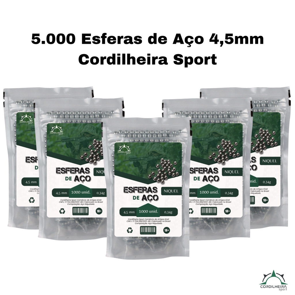 LOJA CORDILHEIRA SPORT! 5.000 ESFERAS DE AÇO 4,5MM 0,34G + 40 ALVOS ROSSI Descrição: Esferas de aço Cordilheira Sport fabricadas em aço níquel, não enferrujam, excelente munição para armas de airgun, também podendo ser utilizadas como munição em estilingues. Características: Marca: Cordilheira Sport Calibre: 4,5mm Peso da esfera: 0,34g Quantidade: 1.000 unidades Material: Aço Niquelado Itens Inclusos: 5.000 Esferas de Aço 4,5mm Cordilheira Sport 40 Alvos de Papel Rossi Garantia: 7 dias pelo vendedor. MANTENHA O PRODUTO LONGE DO ALCANCE DE CRIANÇAS. Todos os produtos anunciados estão em estoque a pronta entrega. Só comercializamos produtos NOVOS e com NOTA FISCAL em nome do comprador e com garantia. Prezamos muito o nosso comprometimento com o cliente, todas as perguntas são respondidas o mais rápido possível COMPRANDO MAIS ITENS DA LOJA VOCÊ TEM DESCONTO NO FRETE!!! VER TODOS OS PRODUTOS DA LOJA EM: “VER MAIS ANÚNCIOS DO VENDEDOR” OU “PERFIL DA LOJA”