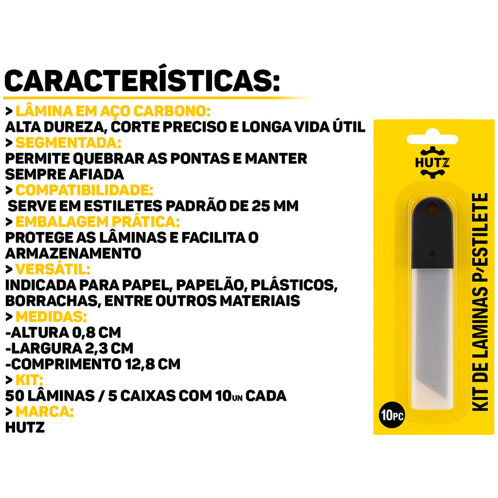 Kit 5 Refis Lâmina Para Estilete 10 Peças Hutz O Refil de Lâminas Hutz é ideal para manter seu estilete sempre afiado e pronto para uso. Compatível com estiletes de padrão universal, cada lâmina é fabricada com aço carbono, garantindo cortes precisos e maior durabilidade. Perfeito para trabalhos em papel, papelão, plástico, tecidos leves e muito mais. Características: > Contém 10 lâminas de reposição; > Ideal para uso profissional ou doméstico; > Fabricadas em aço carbono resistente para cortes limpos; > Acompanha embalagem protetora, ideal para o armazenamento seguro. Especificações Técnicas: > Material: aço carbono; > Dimensões do produto (C x L): 12,8cm x 2,3cm. - Marca: Hutz - Garantia: 90 dias contra defeitos de fabricação Vantagens de comprar na Brester: - Produto a pronta entrega. - Produto novo, com garantia de fábrica. - Nota fiscal para Pessoa Física e Pessoa Jurídica.