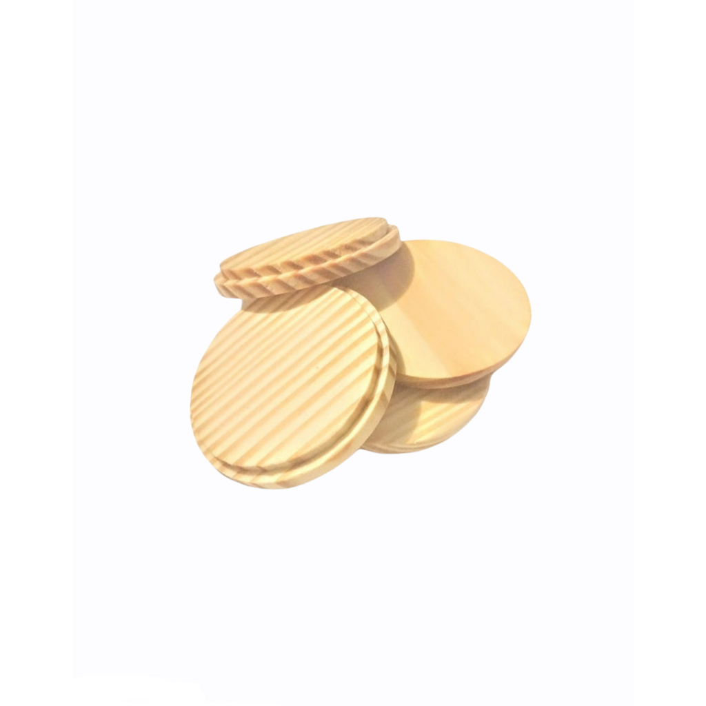 Tampas em madeira de Pinus tratado com óleo mineral. Diâmetro do encaixe: 6,7cm Diâmetro da parte de cima: 7,4 cm Espessura: 2 cm PODE TER CONTATO COM ALIMENTOS.