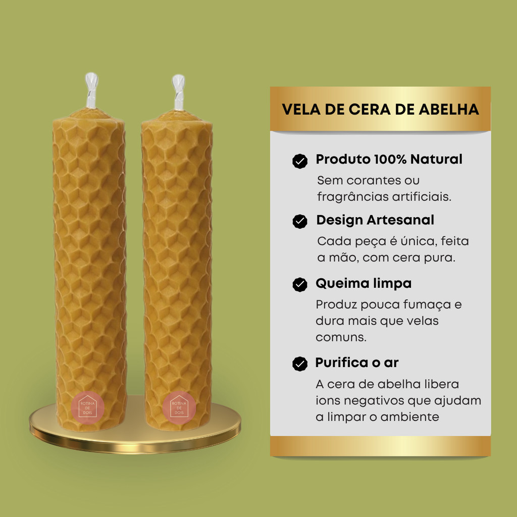 🕯️ Kit com 5 Velas de Cera de Abelha 100% Pura e Natural – 10x2 cm 🌟 Tradição, aconchego e espiritualidade com a qualidade artesanal da Rotina de Dois! Este kit exclusivo contém 5 velas artesanais feitas com cera de abelha 100% pura, sem aditivos nem parafina 🐝 Cada vela tem 10 cm de altura por 2 cm de diâmetro, com queima limpa, uniforme e duração aproximada de 2 horas 🔥 ✨ Por que escolher as velas da Rotina de Dois? 🌿 Produção artesanal e sustentável 💛 Aroma suave e natural da cera pura 🙏 Ideais para altares, meditações, batizados, orações e celebrações 🎁 Excelente opção para presentear no Natal, Dia das Mães ou outras ocasiões especiais 🙋♀️ “Essas velas têm cheiro forte ou liberam fumaça escura?” Não! As velas da Rotina de Dois queimam de forma limpa e suave, com aroma natural da cera pura — sem aditivos ou cheiro artificial. 📦 Conteúdo do Kit: 🕯️ 5 velas artesanais cilíndricas – 10 cm (altura) x 2 cm (diâmetro) 📏 Tamanho ideal para uso decorativo e religioso 🔍 Procurando outros tamanhos ou kits maiores? Confira as opções em “Outros produtos da Rotina de Dois” 📩 Dúvidas ou deseja um pedido especial? A equipe da Rotina de Dois atende com carinho e atenção 💬 🌟 Escolha natural, simbólica e cheia de propósito. Só com a Rotina de Dois 💛 🐝 TUTORIAL PRÁTICO – DICAS DE USO E CUIDADO COM SUAS VELAS 🕯️ Durante o uso: 🔸 Posicione em base firme e resistente ao calor 🔸 Não deixe a vela acesa sozinha ou próxima a objetos inflamáveis 🔸 Evite áreas com vento ou corrente de ar 📦 Como conservar suas velas: 🔸 Armazene em local fresco e arejado 🔸 Evite luz solar direta para não deformar a cera 🔸 Se entortar, aqueça levemente com as mãos e molde com cuidado 🎁 Dica para presente criativo: 🔸 Enrole cada vela em papel kraft com raminhos secos 🔸 Finalize com fita de sisal e uma tag personalizada 🌼 As velas da Rotina de Dois são mais do que luz — são afeto, espiritualidade e conexão com a natureza.