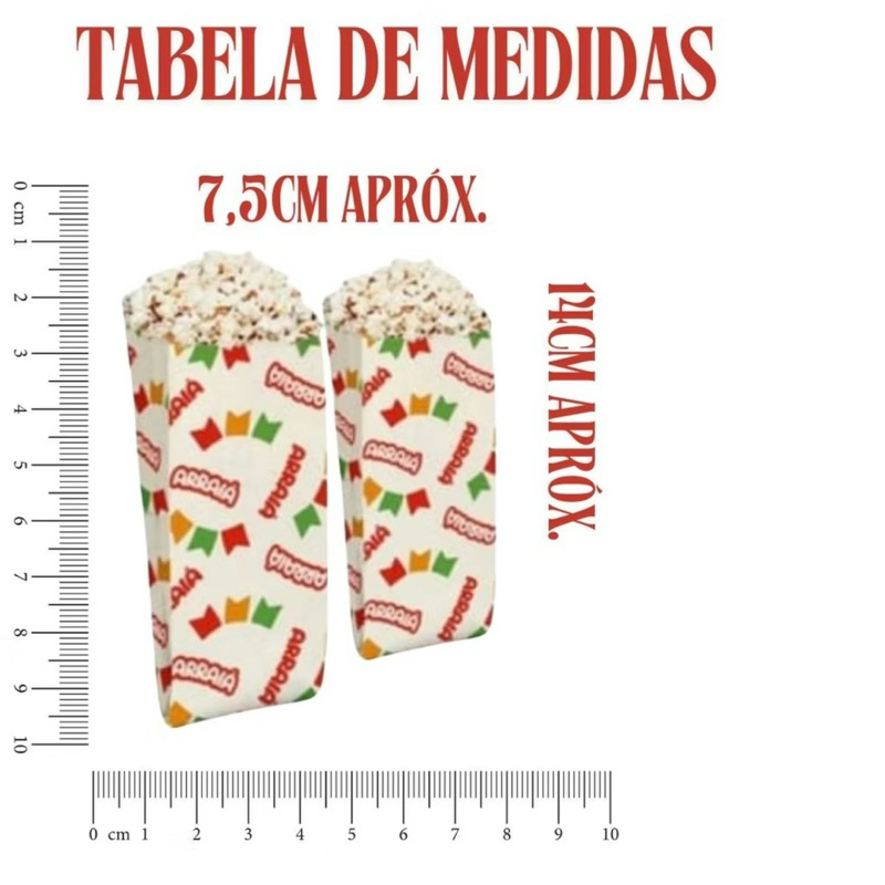 50~250 Saco de Pipoca 7,5x14cm O Saco de Papel para Pipoca é o complemento perfeito para uma experiência cinematográfica ou festiva autêntica. Com sua estrutura resistente e design específico, este saco é ideal para servir porções generosas de pipoca quente de maneira prática e charmosa. Composição: Papel Monolúcido e pigmento atóxicos. Contém 50 unidades.