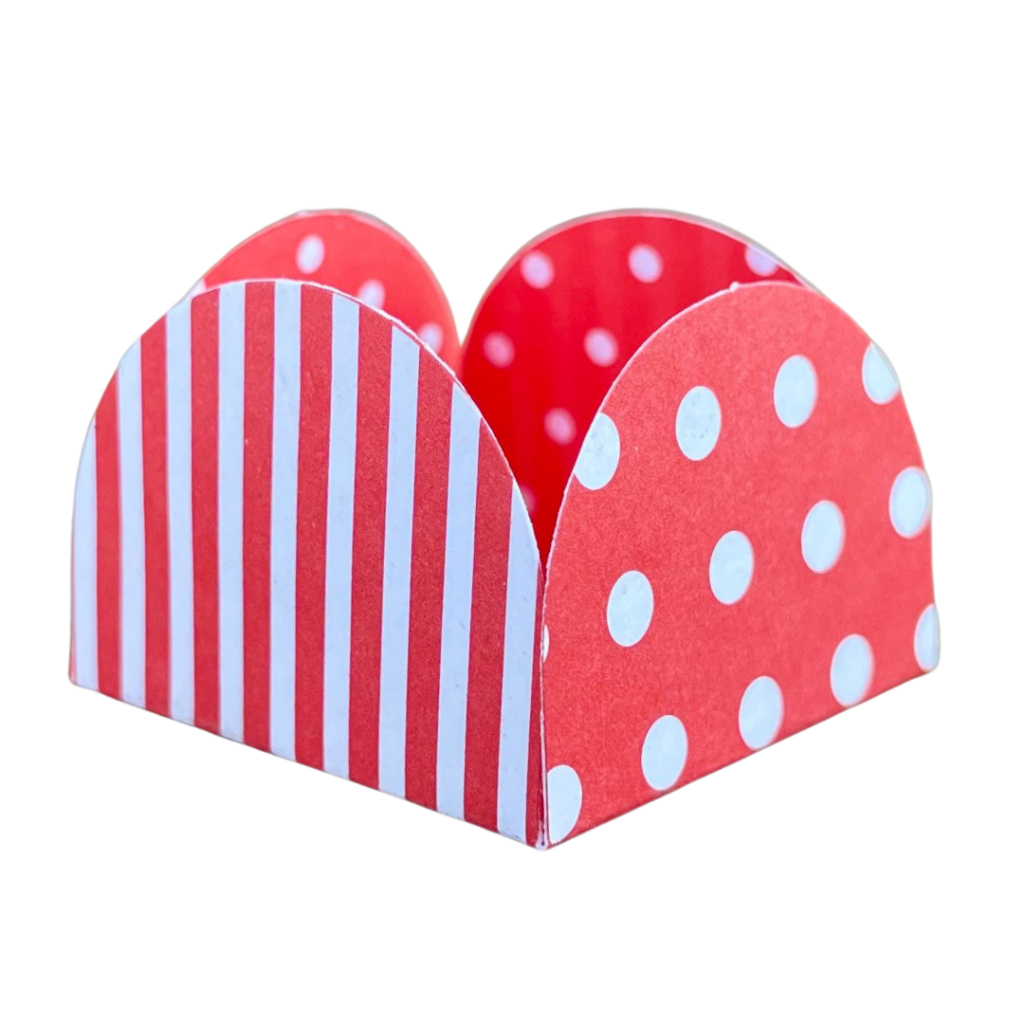 50 A 350 Forminhas para Doces 4 Pétalas Vermelho poá listrado branco - NC Toys As Forminhas para Doces 4 Pétalas da NC Toys são fáceis de montar e utilizadas para doces. Caracteristicas: Papel offset 180g Cor/Tema: Vermelho Poá listrado branco Pode ser usada dos dois lados Medida: - Base de 3,5 centímetros - Largura 3,5 centímetros - Altura 2,6 centímetros Tamanho padrão para docinhos de festa.