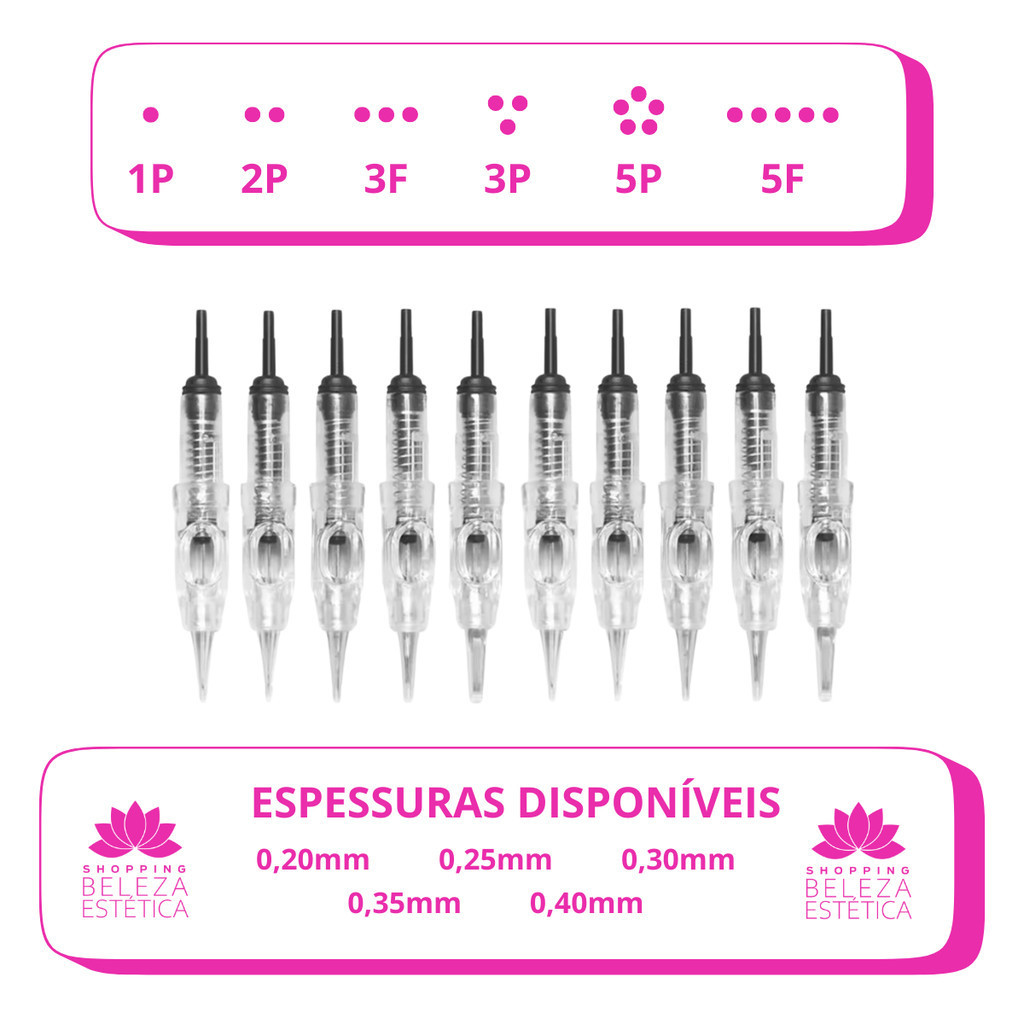 Agulhas Easy Click - Kit com 50 Unidades ************************************************************************************************************** 1 Ponta (0,25mm e 0,30mm) 2 Pontas (0,30mm e 0,35mm) 3 Pontas Circular (0,30mm) 3 Pontas Linear (0,30mm e 0,35mm ) 5 Pontas Circular (0,30mm e 0,35mm) 5 Pontas Linear (0,30mm e 0,35mm) ************************************************************************************************************** (((( SELECIONAR VARIAÇÃO DESEJADA NO MOMENTO DA COMPRA)))) ******************************************************************************************************* PODEMOS REALIZAR ENVIO DE FORMA MESCLADA, MEDIANTE DISPONIBILIDADE. APÓS A CONFIRMAÇÃO DO PEDIDO, ENVIAR MENSAGEM ATRAVÉS DO CHAT. ******************************************************************************************************** As agulhas Easy Click são produzidas em aço com ponta alongada, proporcionando uma implantação de pigmento na pele de forma firme e precisa. A ponta afinada com acabamento justo garante que a agulha não trema, permitindo maior precisão durante o uso. Características: Pulso por MOLA: Acabamento reforçado para maior durabilidade. Tamanho Ideal: Perfeitas para trabalhos de traçados detalhados, como sobrancelhas fio a fio, contorno fino da linha natural dos olhos e contorno de lábios. Praticidade e Qualidade: As agulhas de engate rápido (Easy Click) são conhecidas pela facilidade de uso e alta qualidade. Tecnologia Avançada: Considerado o sistema mais moderno para dermógrafos, proporciona maior precisão nos procedimentos. Compatibilidade: Charmant (Modelo 2020) Cheyenne Sharp 300 Sharp 300 Pro Sharp Black 300 Perfect Line Nouveau Contour (original e similar) Bio Evolution Amiea (modelo antigo) Bee-se da Imbrape Entre outros NÚMERO DE REGISTRO: 81917739002 As agulhas Easy Click são ideais para profissionais que buscam eficiência e resultados de alta qualidade em procedimentos estéticos.
