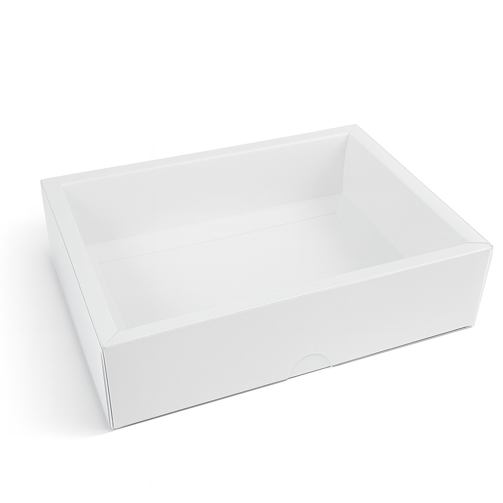 50 CAIXAS 12 DOCES BRANCA MOLDURA RETANGULAR 15,5X11,5X4 TAMPA ACETATO (YIN) P0348