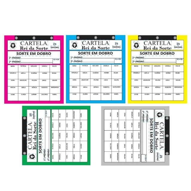 Cartelas de Rifa Rei da Sorte 25 Nomes de Mulheres 2 Ganhadores Pacote com 50 Unidades 5 Cores Diferentes Papel 120 Gramas