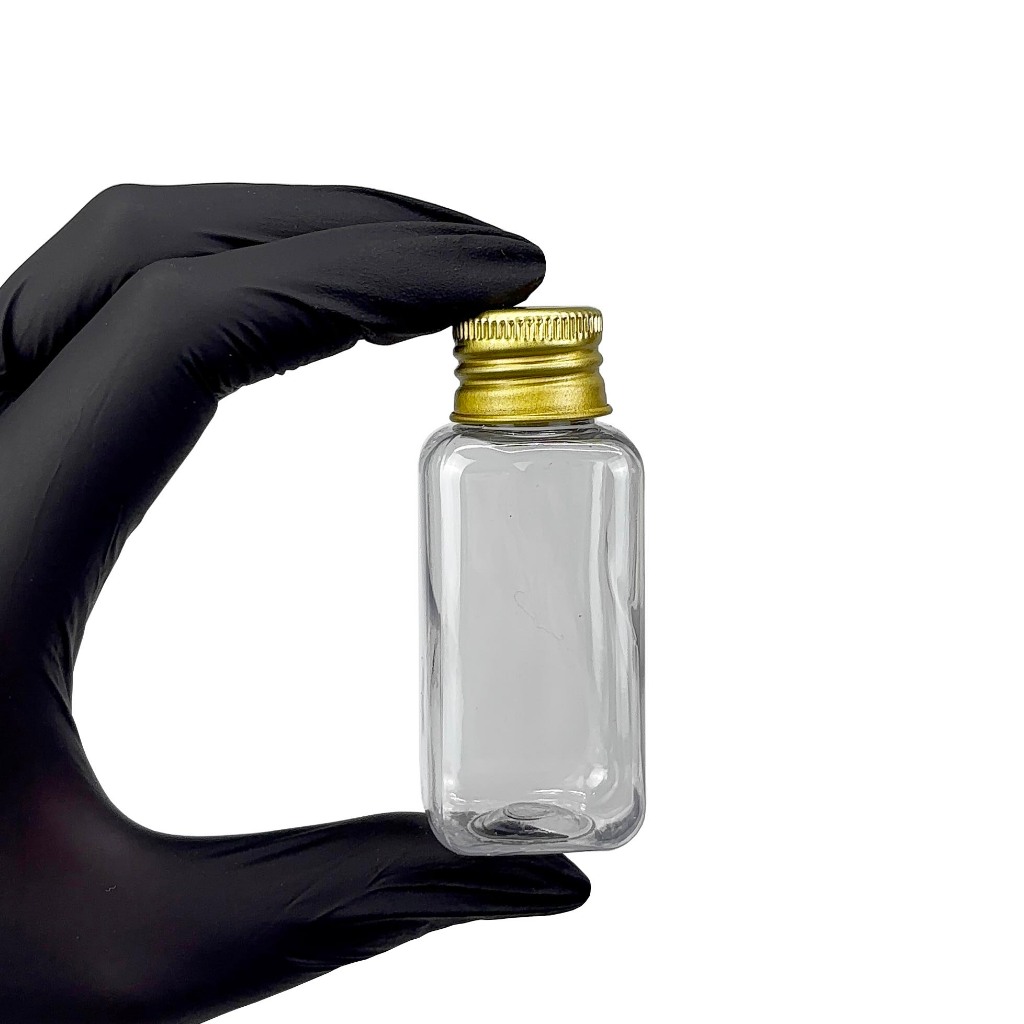 KIT COM 50 FRASCOS PLASTICOS 40ML COM A TAMPA METAL PARA PERSONALIZAR Cor disponível: Dourada e Prata