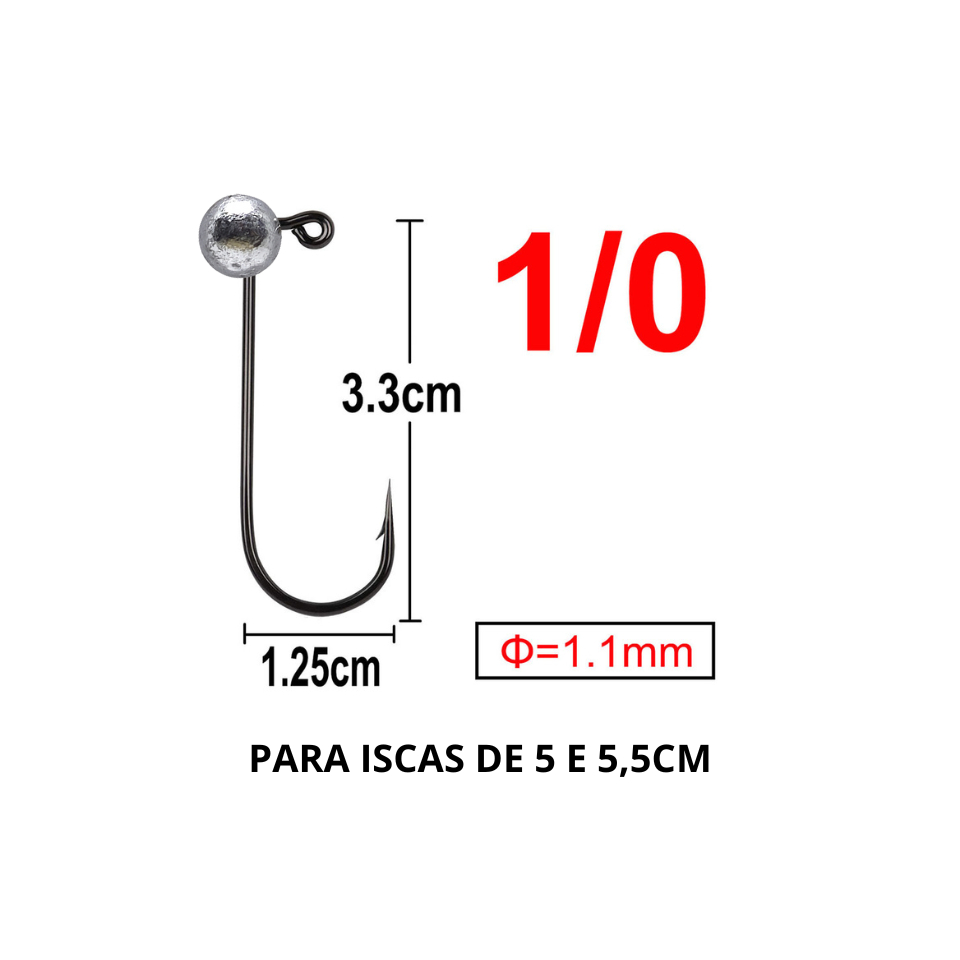 - O anzol jig head Central da Pesca da foi projetado especialmente para iscas artificiais soft como camarões, shads e manjubas para a pesca de fundo para captura de robalo, badejo, peixe galo, corvina, traíra entre outros. - Para fabricação desse acessório é utilizado o anzol 90° nos tamanhos 1/0 , 2/0 , 3/0 , 4/0 ou 5/0 especial para jig head, super afiado e resistente - Possui 4 opção de peso 4g, 6g, 8g,10g, 12g , e 14g.