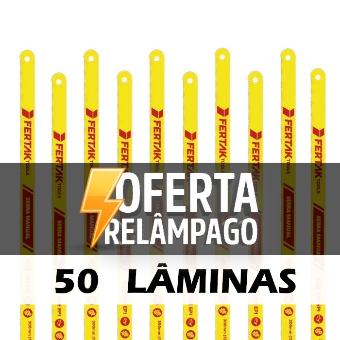 50 Lâminas Para Arco de Serra 12" - 30cm Fertak --- Antes de finalizar a compra verifique o modelo escolhido: 18 DENTES ou 24 DENTES --- Descrição do produto: - Indicada para trabalhos em cobre, tubos de PVC, chapas finas entre outros materiais. - Utilizada em marcenaria, serralheria, esquadria, carpintaria, hidráulica, etc. Especificações Técnicas: Marca: Fertak Cor Predominante: Amarelo Tamanho: 12" Pol. - 30 cm Modelo: 18 ou 24 Dentes Quantidade: 50 lâminas