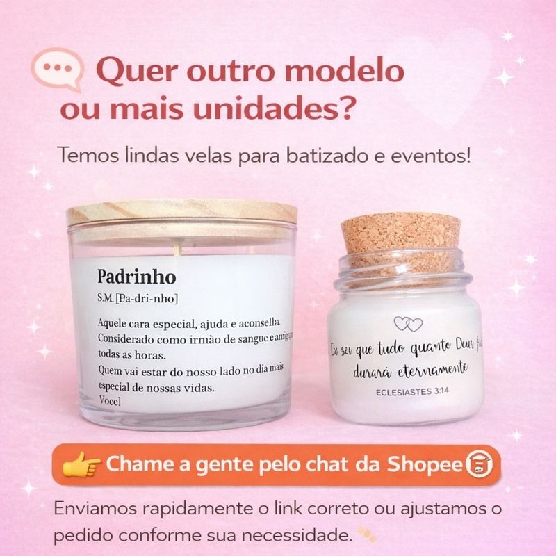 Nossas lembrancinhas são perfeitas para: 🎀 Chá de Bebê 🎉 Chá Revelação 👶 Saída de Maternidade 🙏 Batizado 🙏 Primeira Comunhão ✝️ Crisma 🎂 Aniversários de 15 anos 💍 Casamentos 💞 Noivados 🏢 Eventos corporativos e outras ocasiões especiais. 🕯️ O que oferecemos: Velas aromáticas e perfumadas Sabonetes perfumados 🎨 Diversas opções de cores disponíveis. Caso não encontre a cor desejada, fale conosco pelo chat. 📦 Sobre o envio: Para garantir que seus produtos cheguem em perfeito estado e com frete mais econômico, enviamos o kit desmontado. A montagem é simples e estamos à disposição para ajudar. 💖 Boas compras e volte sempre!