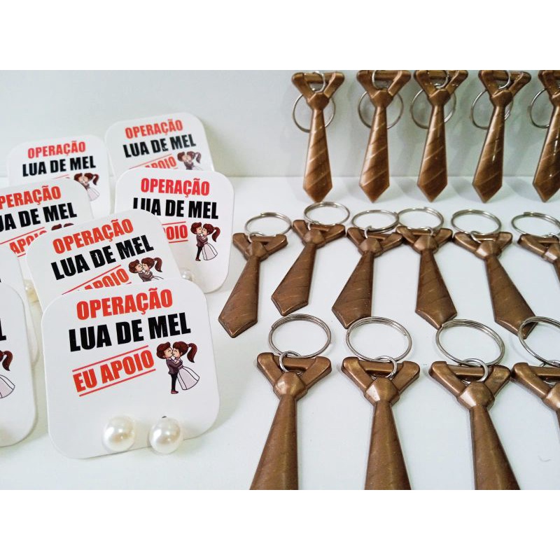 50 pares brincos de pérolas no tags de agradecimento (operação lua de mel ) 50 chaveiros gravatinha dourada pra hora da gravata