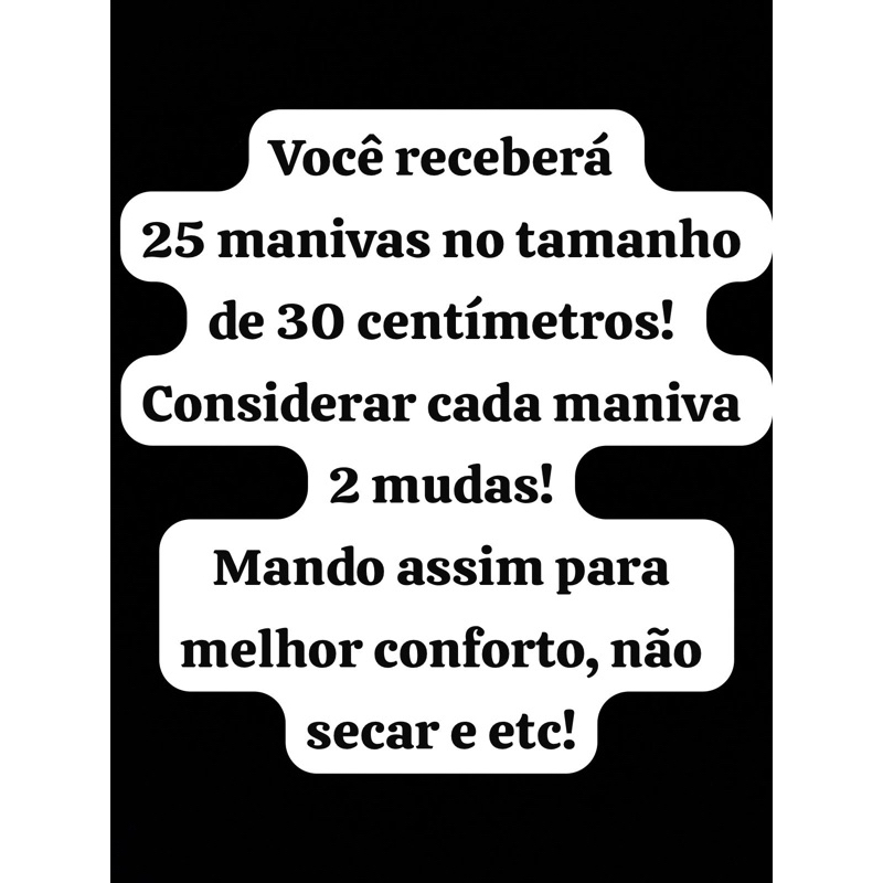 🌱 Mandioca IAC 576-70 – Alta Produtividade e Qualidade Garantida VOCÊ RECEBERÁ PARA CONFORTO 25 MANIVAS NO TAMANHO DE 32 CENTÍMETROS, SENDO CADA 1 MANIVA 2!! 15 CENTÍMETROS TAMANHO IDEAL PARA PLANTIO. A mandioca IAC 576-70 é uma das variedades mais cultivadas e reconhecidas no Brasil, muito apreciada pela excelente qualidade culinária, rápido cozimento e alta produtividade. Ideal tanto para consumo doméstico quanto para produção comercial. ✅ Principais Características: Variedade: IAC 576-70 Tipo: Mandioca de mesa (aipim/macaxeira) Polpa: Amarela e macia Cozimento: Rápido e uniforme Sabor: Suave e muito saboroso Ciclo: Precoce a médio Alta aceitação no mercado consumidor 🌿 Vantagens da IAC 576-70: Excelente rendimento por planta Boa adaptação a diferentes regiões Raízes grandes, uniformes e de ótima aparência Ideal para cozimento, fritura, purê e receitas caseiras 📦 Produto: Ramos/mudas selecionadas Material de plantio saudável e vigoroso 🌾 Indicação de Uso: Indicada para agricultores, produtores rurais, hortas domésticas e agricultura familiar. 🚚 Envio: Produto enviado bem embalado para garantir a qualidade no transporte.