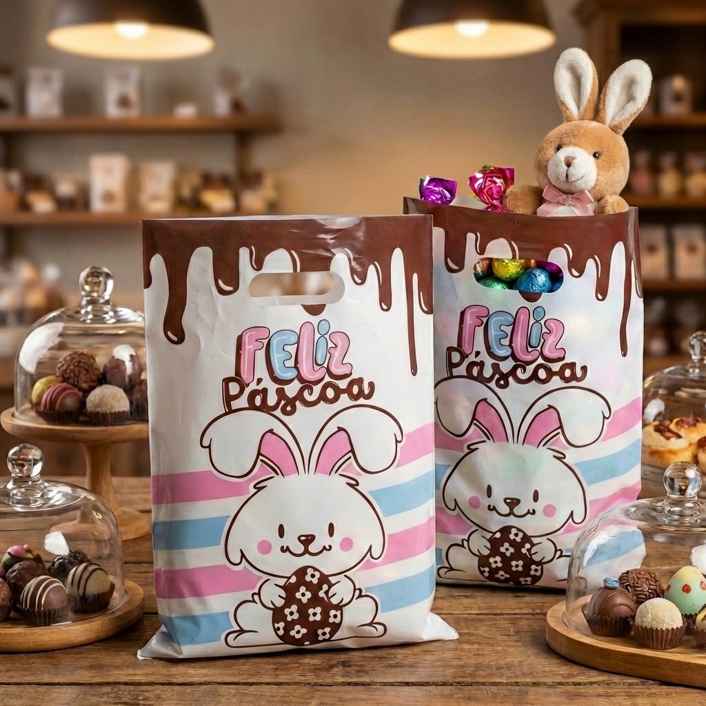 50 Sacolas Páscoa Boca Palhaço PEAD Coelhinho Ovo Presente