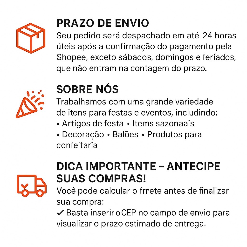 50 Topper Palito Docinho Cupcake Bolinho Decorado Tema Frutinhas Quitanda Feira Deixe seus doces ainda mais charmosos com este kit de toppers no tema , trazendo os personagens mais fofos. Ideal para decorar docinhos, cupcakes, bolinhos e brigadeiros em festas infantis, piqueniques ou eventos temáticos. Características do Produto: Quantidade: 50 unidades sortidas Tema: Frutinhas Material: Papel Glossy 180g (brilho e qualidade superiores). Tamanho aproximado total (com palito): 7 cm de altura. Tamanho aproximado da imagem: 3,5 cm. Palito: Acrílico, pronto para uso. Diferenciais: Impressão em alta qualidade com cores vivas e detalhes nítidos. Prontos para aplicação: basta inserir no doce. Perfeitos para dar um toque especial e encantar convidados. Uso sugerido: Festas infantis. Chá de bebê ou chá revelação. Decoração de mesa de doces. Eventos escolares e piqueniques temáticos. 📦 PRAZO DE ENVIO Seu pedido será despachado em até 24 horas úteis após a confirmação do pagamento pela Shopee, exceto sábados, domingos e feriados, que não entram na contagem do prazo. 🎉 SOBRE NÓS Trabalhamos com uma grande variedade de itens para festas e eventos, incluindo: • Artigos de festa • Itens sazonais • Decoração • Balões • Produtos para confeitaria 🔸 Precisa de uma quantidade diferente ou deseja montar um kit personalizado? Fale conosco! Montamos seu kit com todos os produtos desejados conforme sua lista. 🚚 DICA IMPORTANTE – ANTECIPE SUAS COMPRAS! Você pode calcular o frete antes de finalizar sua compra: ✔ Basta inserir o CEP no campo de envio para visualizar o prazo estimado de entrega. 💨 Utilizamos transportadoras parceiras, garantindo mais agilidade no recebimento do seu pedido!