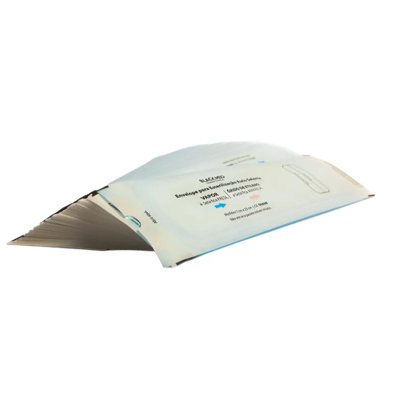 Envelope Auto Selante para Esterilização C/100 Unidades - BLACKMED KIT COM 500 ENVELOPES DE 7X23 Informações sobre a Envelope Auto selante Envelope Auto selante Confeccionado em papel cirúrgico e filme laminado. Possuem fita autoselante que permite o fechamento da embalagem dispensando o uso de seladoras térmicas. Tem indicador do processo de esterilização e sistema triplo de selagem. Higieniza o produto e o deixa pronto para o uso em segurança no que se refere a esterilidade. Possui fita autoselante e indicador do processo de esterilização. Os Envelope de Esterilização Auto selante dispensam a necessidade do uso de seladora térmica para fechamento, tornando-se muito mais práticos. Pacote contendo 100 envelopes Auto selante 7cm x 23cm Possui uma camada de filme plástico laminado transparente + papel grau cirúrgico branco.