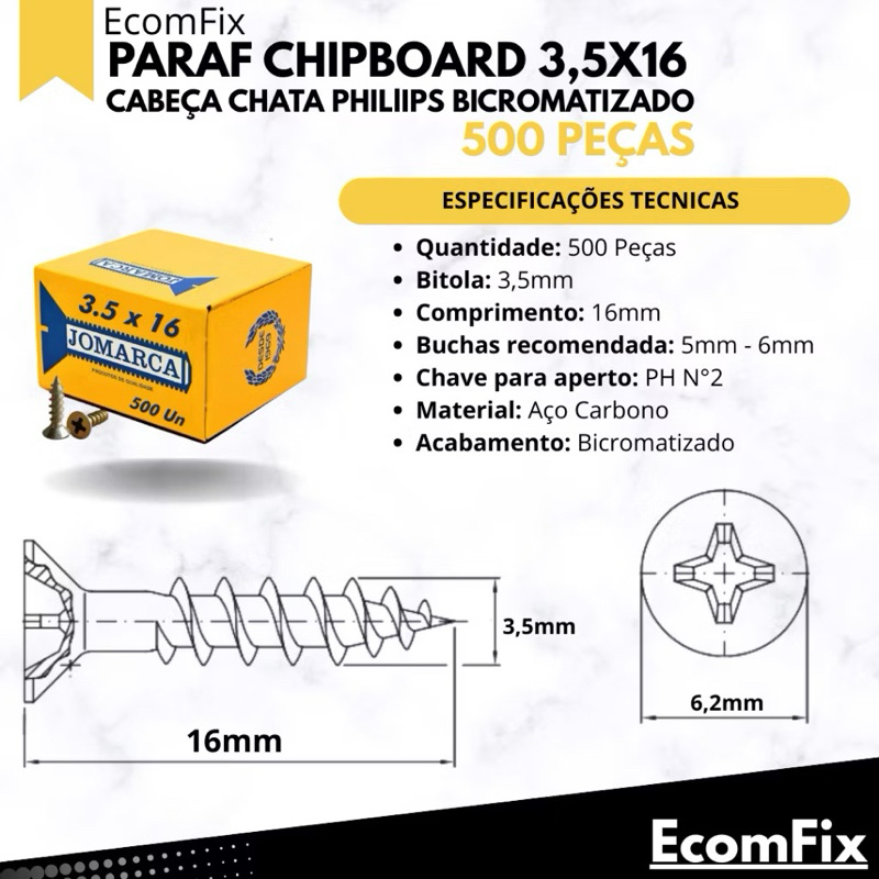 ESPECIFICAÇÕES: • Modelo: Chipboard Para Madeira • Diâmetro: 3,5mm • Comprimento: 16mm • Tipo da Cabeça: Chata • Tipo de Fenda: Phillips • Acabamento: Bicromatizado • Forma da Rosca: Parcial Sobreposta • Material: Aço Carbono COMPRA SEGURA • Produto com Nota Fiscal. Agradecemos sua visita, qualquer dúvida estamos a disposição!