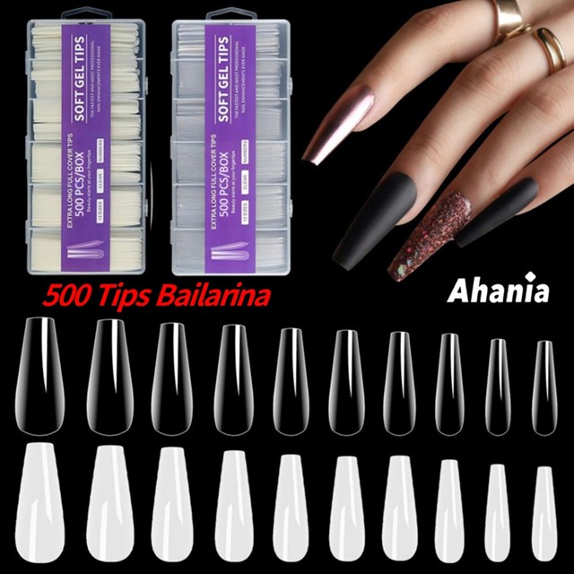 500 Unhas Tips Unha Postiças Modelo Bailarina Longa Cor Transparente E Bege Estojo Acrilico