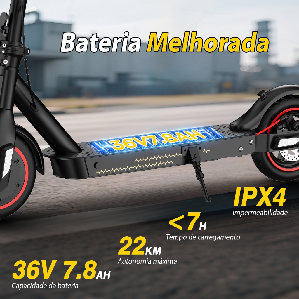 Especificações da scooter elétrica 1. Modelo: E9T 2. Tensão de saída: 36 V 3. Capacidade da bateria: 7,8 AH 4. Tempo de carregamento: 6–8 horas 5. Potência do motor: Potência nominal 350 W Potência máxima até 500 W 6. Tamanho dos pneus: 8,5 polegadas 7. Tipo de pneus: Pneus pneumáticos 8. Classificação de resistência à água: IPX4 9. Velocidade máxima: 32 km/h 10. Alcance máximo: 22 km 11. Capacidade máxima de carga: 120 kg 12. Material do quadro: liga de alumínio 13. Sistema de travagem: travões de disco + EABS 14. Ecrã do painel de instrumentos: nível da bateria/quilometragem/velocidade/marcha/luzes