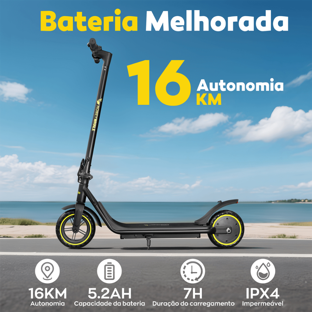 Motor Potente de 500W: O patinete elétrico HONEYWHALE M1 LITE vem equipado com um motor robusto de 500W, oferecendo 4 modos de velocidade ajustáveis e alcançando até 25KM/H. Atende a diferentes necessidades de condução. Com uma única carga, pode percorrer 16KM, tornando os deslocamentos diários, compras ou passeios curtos muito mais práticos e eficientes. Condução Inteligente e Controle Prático: O scooter conta com um sistema de controle inteligente. A tela LCD exibe em tempo real informações essenciais como velocidade, autonomia e nível da bateria. Através da conexão Bluetooth com o aplicativo exclusivo, é possível travar o veículo, alternar modos de condução, controlar as luzes e ativar o piloto automático com apenas um clique. Uma solução completa para oferecer mais conveniência em cada viagem. Pneus Sólidos de 8,5 Polegadas: Equipado com pneus sólidos de alta elasticidade de 8,5 polegadas, dispensa preocupações com furos ou vazamentos. Garante uma condução estável mesmo em ruas irregulares ou caminhos de cascalho, proporcionando conforto e segurança. Um parceiro confiável para deslocamentos urbanos e explorações ao ar livre. (Requer instalação da roda dianteira, processo muito simples). Segurança Reforçada: O sistema de freio eletrônico responde de forma rápida, garantindo frenagens suaves e eficientes, reduzindo a distância de parada. O farol dianteiro superbrilhante ilumina o caminho, enquanto a lanterna traseira com sensor automático pisca em alta frequência durante a frenagem, aumentando a segurança em trajetos noturnos. Certificado pela UL2272, atende a rigorosos padrões de segurança para garantir tranquilidade em cada viagem. Dobrável em 3 Segundos, Portátil e Leve: O design inovador de dobra permite que o scooter seja dobrado em apenas 3 segundos. Pesando apenas 12,5kg, pode ser carregado facilmente com uma mão. Compacto após dobrado, cabe no porta-malas do carro ou em pequenos espaços sem ocupar muito lugar. Suporta até 120kg, adequado tanto para adultos quanto adolescentes, tornando suas viagens ainda mais práticas.