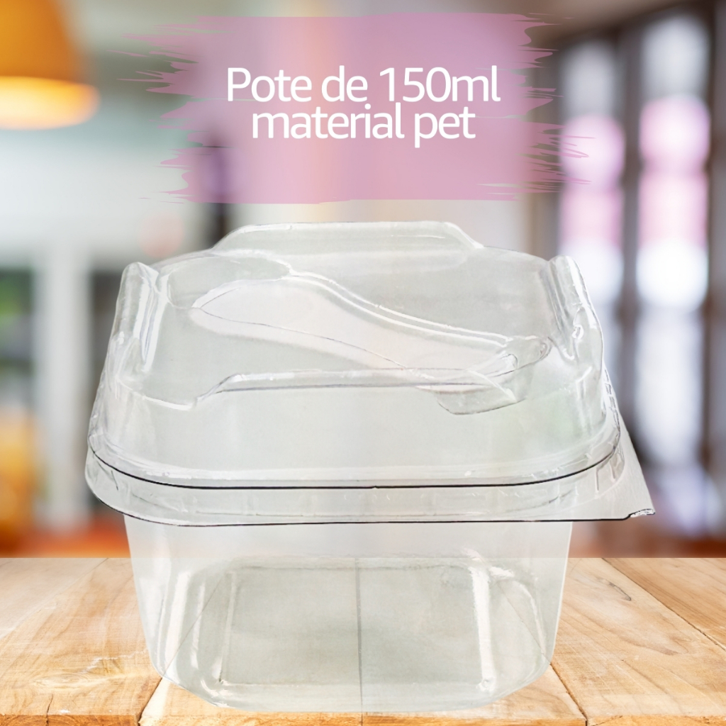 50 unidades de Pote Quadrado para Bolo de Pote 150ml com Mini Colher Facilite e profissionalize suas criações de bolos de pote com nossos potes quadrados de 150ml, acompanhados de mini colher. ✅ Características: - Capacidade:150ml - Dimensões: 8 cm x 6 cm x 6 cm - Material: PET de alta qualidade, livre de BPA - Uso: Ideal para armazenar bolos, tortas, doces e cremes - Aplicação: Amplamente utilizado em restaurantes, lojas de alimentos e confeitarias ✅ Benefícios: - Resistente e seguro para transporte - Perfeito para manter a temperatura de sobremesas em geladeira e freezer de bolo (Não pode ir ao congelador) - Design estético com acabamento de qualidade ✅ Aplicações recomendadas: - Bolos de pote - Tortas - Mousses - Pavês - Doces e sobremesas em geral ✅ Informações Adicionais: - FORMA DE USAR: Sua função Principal é armazenar bolos, doces, bolo de pote e tortas. - MATERIAL: Fabricado com material Pet de alta qualidade é resistente e livre de BPA. É higiênico e possui um ótimo acabamento estético. É bastante utilizado em restaurantes e a tampa adere muito bem a base deixando a embalagem segura para transporte. - RECURSOS: Espaço interno com capacidade para 150ml, ideal para diversos tipos de porções de doces. Aceita ir na geladeira ou freezers de bolos para conservar a temperatura da sobremesa. Profissionalize a produção culinária com praticidade e elegância utilizando nossos potes quadrados de 150ml com mini colher acoplada. Imagens meramente ilustrativas, a sobremesa não acompanha o produto. As imagens contêm direitos autorais, cópia e divulgação restrita. Embalagens para bolos de pote, Embalagem higiênica para bolo de pote, Embalagens para tortas, Embalagem para mousse, Potinho para mousse, Embalagem para pavê, Embalagens para doces, Potinhos para sobremesas, Embalagem para bolo com colher