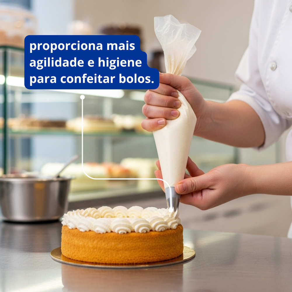 DETALHES - Produto: Saco de Confeiteiro. - Marca: Vabene. - Material: Plástico. - Modelo: Super resistente. - Linha: Confeitaria. - Cor: Transparente. - Tamanhos disponíveis: P (31cm x 19cm), M (34cm x 22cm) e G (38cm x 27cm). - Contém: 50 unidades. - Super resistente. - Proporciona mais agilidade e higiene para confeitar bolos. - Ideal para armazenagem. - Para uso quente e frio ( -30ºC a 125ºC). - Produto descartável. - Não vai ao micro-ondas.