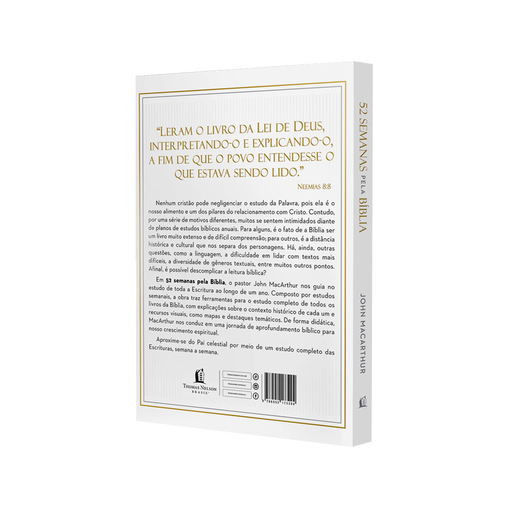 52 Semanas Pela Bíblia | John Macarthur John MacarthurTransforme o estudo da Bíblia de um desafio intimidante em uma jornada clara e acessível. Em 52 Semanas Pela Bíblia, o renomado pastor e autor John MacArthur oferece um guia anual completo e descomplicado para você percorrer toda a Escritura, superando as barreiras de extensão, linguagem e contexto histórico que muitas vezes dificultam o entendimento. Este livro é a resposta para o cristão que deseja se aprofundar, mas não sabe por onde começar. Organizado em 52 estudos semanais objetivos, a obra fornece um mapa estruturado para explorar cada livro da Bíblia. Com a didática característica de MacArthur, você terá acesso a: Contexto histórico e cultural preciso de cada livro.Explicações claras de passagens e conceitos complexos.Recursos visuais como mapas e destaques temáticos que facilitam a compreensão.Uma visão panorâmica e conectada do plano redentor de Deus.Mais do que um plano de leitura, é uma ferramenta de discipulado e crescimento espiritual. Projetado para gerar consistência sem sobrecarregar, este guia o conduz, semana após semana, a um relacionamento mais rico e profundo com a Palavra de Deus. Ideal para: Novos convertidos, cristãos que buscam um estudo bíblico sistemático, líderes de pequenos grupos e qualquer pessoa que deseja construir o hábito sólido de examinar as Escrituras com a profundidade e clareza de um dos maiores teólogos de nossa época. Aproxime-se do Pai celestial através de um estudo completo e transformador. Detalhes do produto 52 Semanas Pela Bíblia | John Macarthur:Título:52 Semanas Pela Bíblia | John MacarthurAutor:John MacarthurData da publicação:23.12.2025Idioma:PortuguêsCapa:Brochura Número de Páginas:320 Dimensões:24 x 17 x 1 cmPeso:488gISBN:9786552173294Editora:Thomas Nelson Brasil