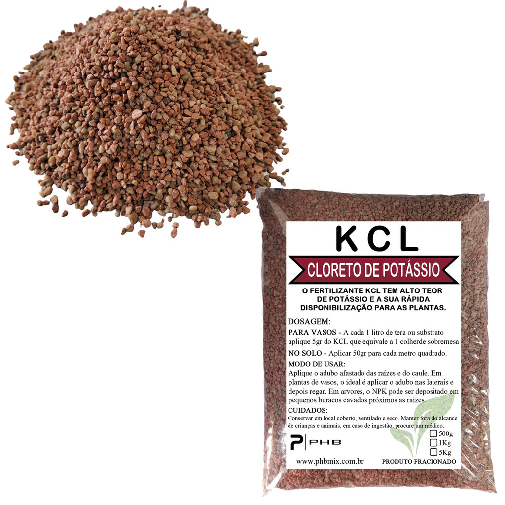 CONTEÚDO:_x000d_ _x000d_ 5Kg de Adubo Fertilizante KCL Cloreto de Potássio_x000d_ _x000d_ EMBALAGEM FRACIONADA_x000d_ _x000d_ _x000d_ DESCRIÇÃO:_x000d_ _x000d_ O fertilizante cloreto de potássio (KCl) é um fertilizante do grupo dos potássicos que apresenta cerca de 60% de óxido de potássio em sua composição, atendendo as mais diversas culturas agrícolas._x000d_ _x000d_ O fertilizante KCl tem alta qualidade e eficiência para assegurar um crescimento progressivo da planta, inclusive atua como um regulador osmótico, evitando sua desidratação e auxilia no processo da fotossíntese._x000d_ _x000d_ Com alta concentração de potássio (K), este fertilizante granulado do grupo dos potássicos, é indicado para cultura do café, milho, soja, arroz, trigo, algodão, citros, uva, cenoura, manga, tomate, batata, maçã, hortifrúti, entre outras. Sua eficácia comprovada garante uma lavoura de alta produtividade._x000d_ _x000d_ Fácil de aplicar, o fertilizante KCl é um dos mais utilizados no plano de adubação das lavouras, pois além de produzir carboidratos, atua na síntese de proteínas e melhora significativamente a qualidade dos grãos. Com alto teor de potássio, o fertilizante Cloreto de Potássio (KCl) consegue fornecer rapidamente todos os nutrientes que a lavoura precisa para crescer de maneira estável._x000d_ _x000d_ _x000d_ RECOMENDAÇÕES DE USO:_x000d_ _x000d_ Potássio (K) é um nutriente de extrema importância para as culturas, visto que é o principal regulador osmótico das células vegetais. O Cloreto de Potássio (KCl) é o principal fornecedor deste nutriente uma vez que há grande concentração de Potássio (K) nas formulações NPK produzidas._x000d_ _x000d_ Pode ser utilizado na cobertura._x000d_ _x000d_ _x000d_ BENEFÍCIOS:_x000d_ _x000d_ O fertilizante KCl tem alto teor de potássio e a sua rápida disponibilização para as plantas._x000d_ _x000d_ _x000d_ ASPECTO DO PRODUTO:_x000d_ _x000d_ Grânulos nas cores vermelha ou branca._x000d_ _x000d_ _x000d_ CULTURAS:_x000d_ _x000d_ Soja_x000d_ Algodão_x000d_ Café_x000d_ Batata_x000d_ Citros_x000d_ Tomate_x000d_ Feijão_x000d_ Uva_x000d_ Manga_x000d_ Maçã_x000d_ Cenoura_x000d_ Hortifruti_x000d_ _x000d_ _x000d_ _x000d_ _x000d_ _x000d_ _x000d_ _x000d_