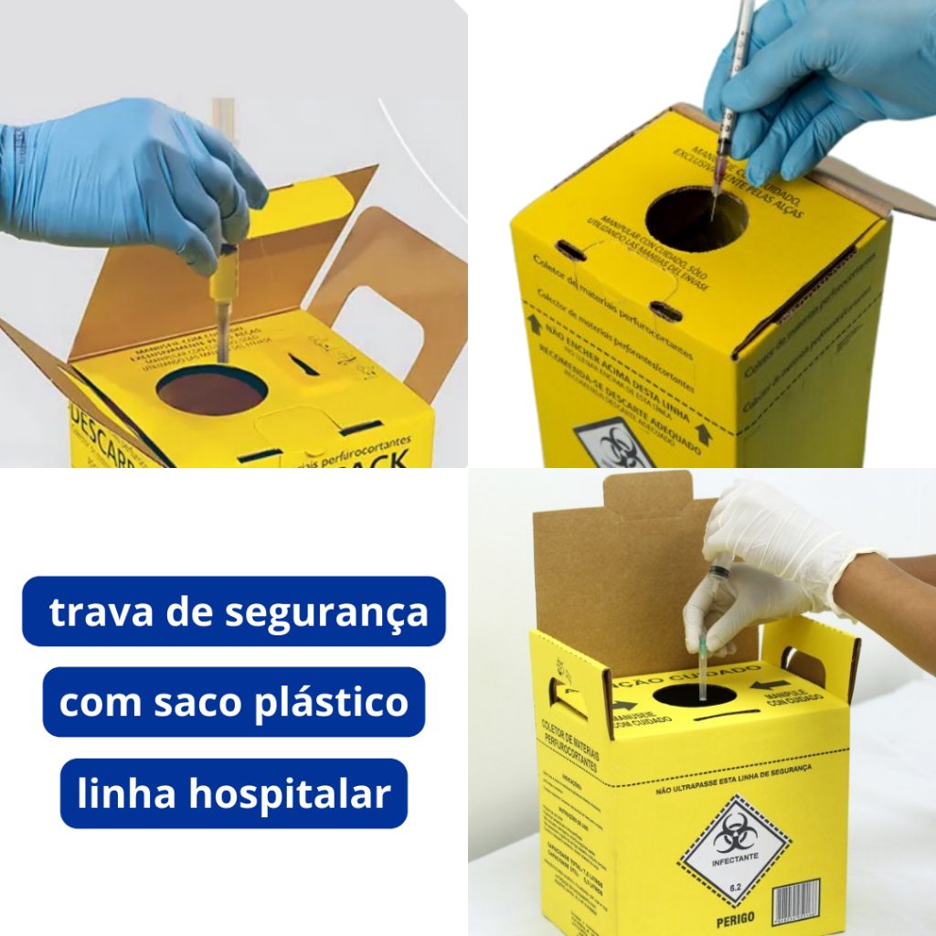DETALHES - Produto: Caixa Coletora. - Marca: Descarpack. - Material: Papelão. - Modelo: Perfurocortante. - Linha: Hospitalar. - Cor: Amarelo. - Tamanhos disponíveis: 1,5L, 3L, 7L, 13L e 20L. - Contém: 5 unidades (5 caixas coletora). - Possui alça dupla para transporte. - Desconector de agulha no modelo 1,5L. - Ideal para descarte seguro de materiais perfurocortantes. - Trava de segurança para fechamento do coletor depois da utilização. - Ideal para clínicas, hospitais, laboratórios e ambientes de saúde. - Material resistente e de fácil montagem. - Garante segurança, praticidade e higiene no manuseio. - Atende às normas e regulamentações de biossegurança. - Acompanha sacola plástica para introdução no coletor, tornando-o impermeável por dentro.