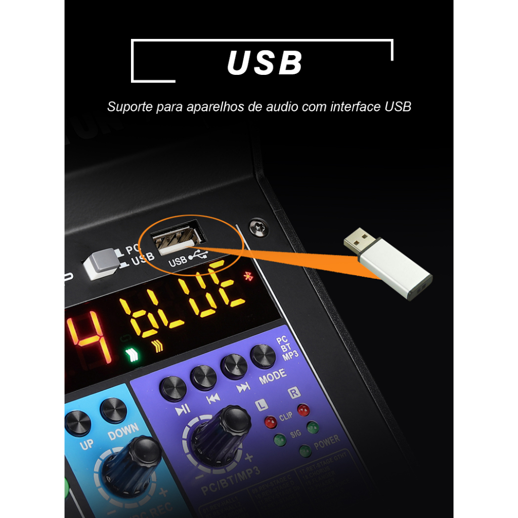 Audio mixer com placa de som diqital 6 canais: 4 MIC / 2 entradas de linha (4 mono + 2 stereo) Alta resoluco, gravacao dual track e saida de playback Chip ARM de alta velocidade integrado com reduco tnico de ruido, modulador devoz tom de voz, reverb. delay, efeitos de musica eletronica entre outros Diversas interfaces de entradas / saidas de audio, varios modos de gravaco Modo de entrada de alimentacao super universal e comutaco da fontede alimentacao fantasma de 48 V Equalizador de alta qualidade e filtro de alta passagem Vrios grupos de broadcast e modos de monitoracao dupla Funcao de LOOPBACK flexivel, perfeito para gravaco e transmisso ao vivo. Entradas balanceada para interfaces de microfones XLR Visor no status de gravacao 1.Frequencia de resposta. Entrada stereo com saida de 0,5 dB / 10 dB (20 Hz ~20 kHz).Nivel de referencia na saida: 1kHz Ganho: medio 2.THD +N: 0.1% + 10 dbu(20 Hz para 20 kHz) Ganho: medio 3.Entrada de canais: MIC*4,2RCA, PC.2LINE. USB 4.Saida canais: Saida stereo: 2 Fones:1 3,5 saida Mini Fone: 1 3.5 saida mini LOOPBACK:1 5.Buster: STEREO: 1 6.Canais de entrada: HPE(mono): 80Hz.12dB /ctave (CH3.4) 7. Equalizador de ganho alto: 15dB /- dB Frequencia: 10kHz de inclinacoEqualizador de ganho baixo: 15dB /- dB, Frequencia: 100kHz de inclinacoLED de pico: quando o sinal do equalizador atinge 3dB abaixo da distorcao, 0 LED estara lidado8. Nivel do Stereo pricipal: quando o nivel do sinal atinge 0dB, a luz verde esta acesa, quandoatinge 3dB abaixo da distorcao a luz vermelha esta acesa 9.Niveis de entrada e saida. MIC(60 dB) LINE(- 40dB)