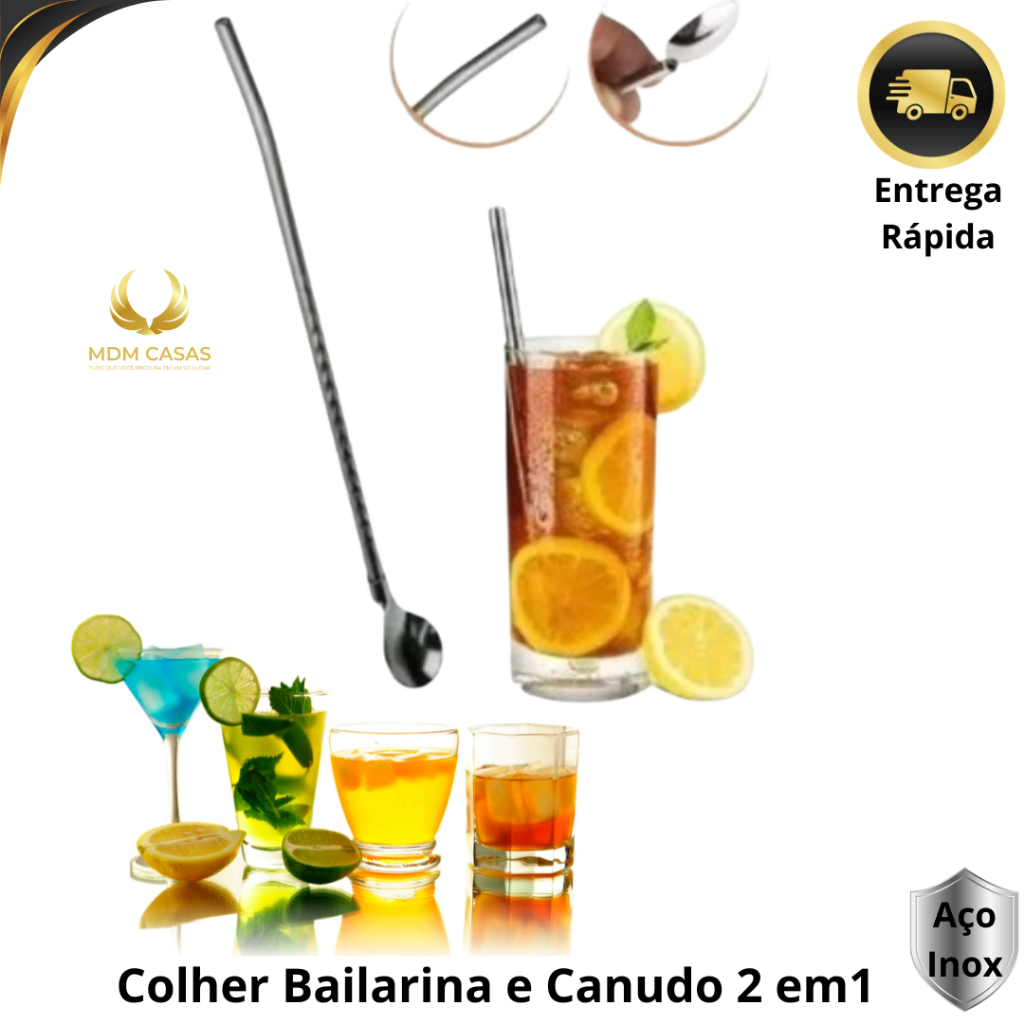 6 Colher Canudo Bailarina + Limpador em Aço Inox Premium Dupla Função para Drinks Sucos Batidas
