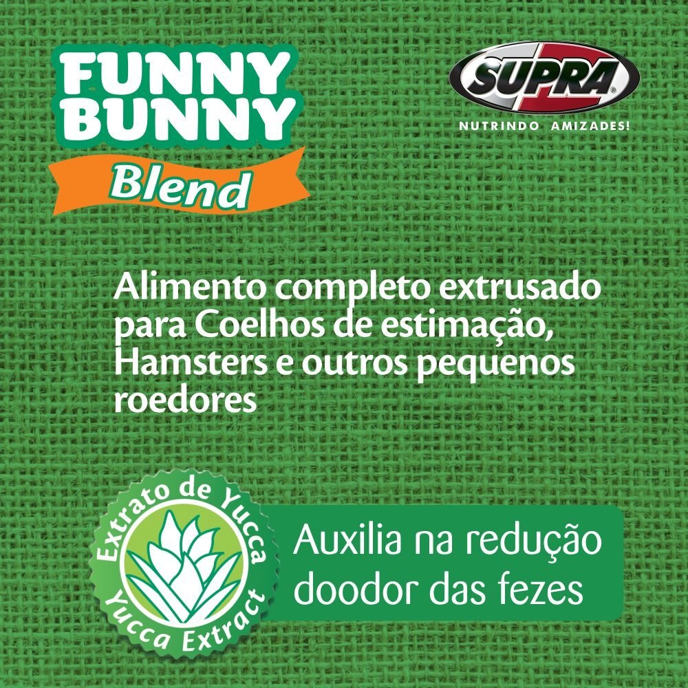 A Ração Funny Bunny Delícias da Horta é ideal para coelhos de estimação e pequenos roedores, elaborado a partir de vegetais nobres, como a alfafa verde, que aporta vitaminas e fibras essenciais para a digestão, visão e eliminação de bolas de pelo. Contém cenoura desidratada, vitamina C que favorece a calcificação dos ossos, auxilia na visão e atua como antioxidante natural. Alimento extrusado completo para coelhos de estimação, hamsters e outros pequenos roedores. DESCRIÇÃO: Alimento extrusado exclusivo para coelhos de estimação, porquinhos-da-Índia, hamsters e outros pequenos roedores. Elaborado a partir de vegetais nobres como a alfafa, que aporta nutrientes como proteína, cálcio, fibras e vitaminas com importantes benefícios para o crescimento e manutenção de tecidos, calcificação dos ossos, digestão e saúde intestinal, e a cenoura desidratada, cujas vitaminas A, C e E e o pigmento natural betacaroteno atuam na manutenção da visão e como antioxidantes naturais. MODO DE USO: Ofereça cerca de 30 a 50 gramas por dia, deixando à disposição em comedouro de fácil acesso e limpo. Para os Coelhos e Porquinhos-da-Índia, o período de atividade mais intensa é pela manhã, já para os Hamsters, Chinchilas e Gerbils, o período de maior atividade é na parte da noite; Este alimento pode ser complementado com pequenas porções de frutas, verduras e legumes bem lavados e frescos, evitando porém o excesso; Mantenha sempre à disposição água e feno de gramíneas ou capim frescos e limpos. Descarte os restos não consumidos. Enviamos o seu pedido o quanto antes possível! Obrigado pela preferência.