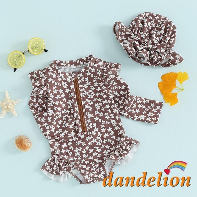 6 Meses-3 Anos Fato De Banho Baby Girls Round Neck Flower Impressão Long Sleeve Zipper + Swim Cap Beach Wear