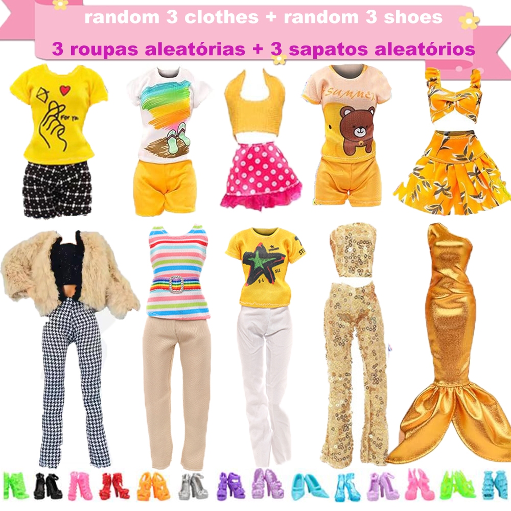 Pacote: 6 itens = 3 roupas aleatórias para boneca de 11,5 polegadas + 3 pares de sapatos Nome da boneca Idade recomendada: 25-36m Idade recomendada para recomendar a idade: 4-6 anos Idade Recomendada:7-12y Recomendar idade: 12+y Material do pano: pano Material: pano Origem: CN (Origem) Gênero unissex Aviso de Boneca Certificação: CE
