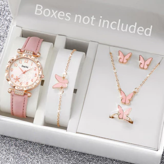 6 Peças Moda Flores Mostrador Relógio De Quartzo Feminino Pulseira De Couro Conjunto De Joias Borboleta Sem Caixa