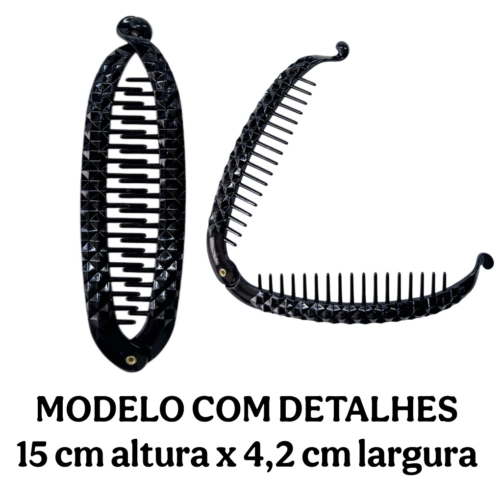 Ao efetuar a compra, você receberá 06 presilhas para cabelo modelo BANANA. COR: PRETO. ** Medidas aproximadas ** Modelo tradicional: 15 cm altura x 4,2 cm largura. Modelo com detalhes: 15 cm altura x 4,2 cm largura. Modelo 2 (curvado) : 14,5 cm altura x 3 cm largura.