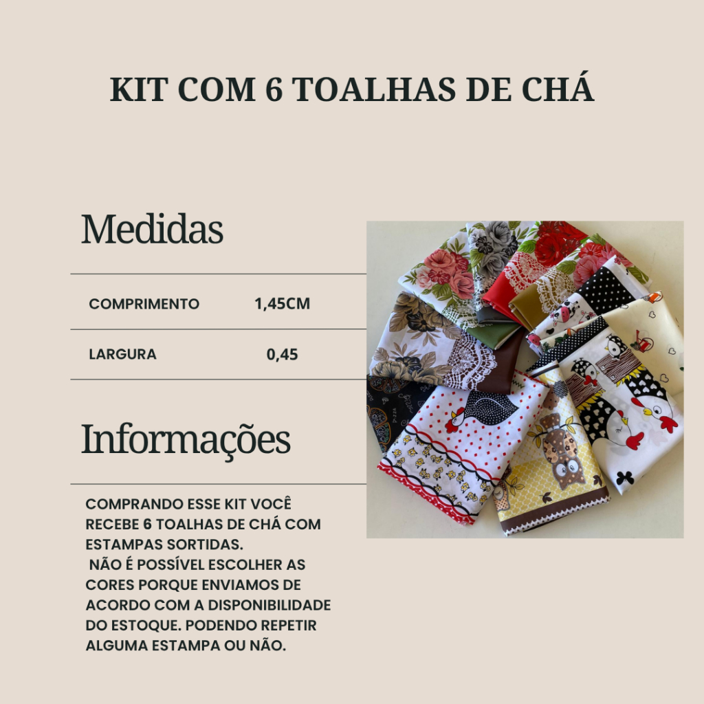 NESSE KIT CONTÉM 6 TOALHAS DE CHÁ COM ESTAMPAS SORTIDAS, ENVIAMOS DE ACORDO COM A DISPONIBILIDADE DO NOSSO ESTOQUE NAO E POSSIVEL ESCOLHER AS ESTAMPAS TAMANHO 0,70 X 0,55M TECIDO 100% POLIÉSTER NÃO PRECISA PASSAR LAVAGEM NORMAL FABRICAÇÃO PRÓPRIA ÓTIMO ACABAMENTO ✨ Estampas Diversificadas: Com uma variedade de designs estampados cuidadosamente escolhidos, cada toalha de chá é uma peça única que adiciona personalidade e charme à sua decoração. ✨ Tecido de Qualidade: Fabricado em Tecido Oxford, cada TOALHA DE CHÁ combina resistência e um acabamento liso, garantindo uma aparência impecável e uma longa vida útil. ✨ Transformação Rápida: Uma maneira fácil e eficaz de alterar a atmosfera de sua sala de jantar ou cozinha, adaptando-se a ocasiões formais e casuais. ✨ Kit Versátil: O conjunto oferece estampas sortidas, permitindo que você alterne entre designs e renove a atmosfera de sua mesa sempre que desejar. ✨ Manutenção Simples: O Tecido Oxford é fácil de limpar, resistente a manchas e seca rapidamente, mantendo seus caminhos de mesa sempre prontos para a próxima ocasião. ✨ Estilo Garantido: Seja para um jantar especial, um almoço descontraído ou uma celebração festiva, estes caminhos de mesa elevam a estética de qualquer refeição. Renove sua mesa com um toque de classe! Os Toalhas de Chá com Estampas Sortidas são a escolha perfeita para quem busca versatilidade e estilo em suas refeições e eventos. Adquira o seu kit e sinta a magia de uma decoração sempre renovada em sua mesa. 🌹🏡🍷