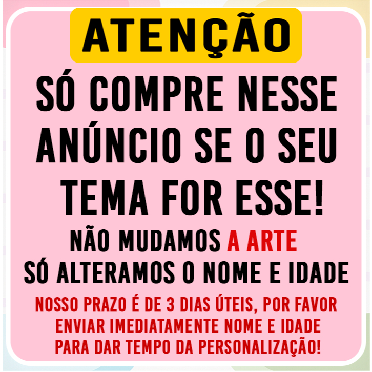 - Nos informe imediatamente no chat o nome e idade do aniversariante. - Devido a grande fluxo de produção NÃO ENVIAMOS ARTE PARA APROVAÇÃO, ENTÃO VERIFIQUE SE OS DADOS ESTÃO TODOS CORRETOS! - SOMENTE TAMANHO 5X5 - CORTADO (Só destacar e colar) - NÃO MONTAMOS LOGO OU ARTE PARA COMÉRCIO. - PARA OUTROS TEMAS VERIFICAR NO CHAT A DISPONIBILIDADE ANTES DE EFETUAR A COMPRA. - As cores podem sofrer variação entre tela do seu monitor ou celular e material impresso. - FOTO ILUSTRATIVA. - Impresso em Papel Fotográfico Glossy Adesivo (Não é a prova d'água) - Ideal para personalizar itens de festa. - O produto será enviado igual ao anuncio. - Se os dados não forem enviados em até 24H os adesivos vão somente com o tema escolhido, sem os dados. - Confira o prazo de PRODUÇÃO e de entrega na hora da compra.