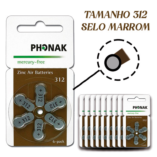 60 Pilhas/Baterias PHONAK para Aparelho Auditivo - tamanho 312 - SELO MARROM