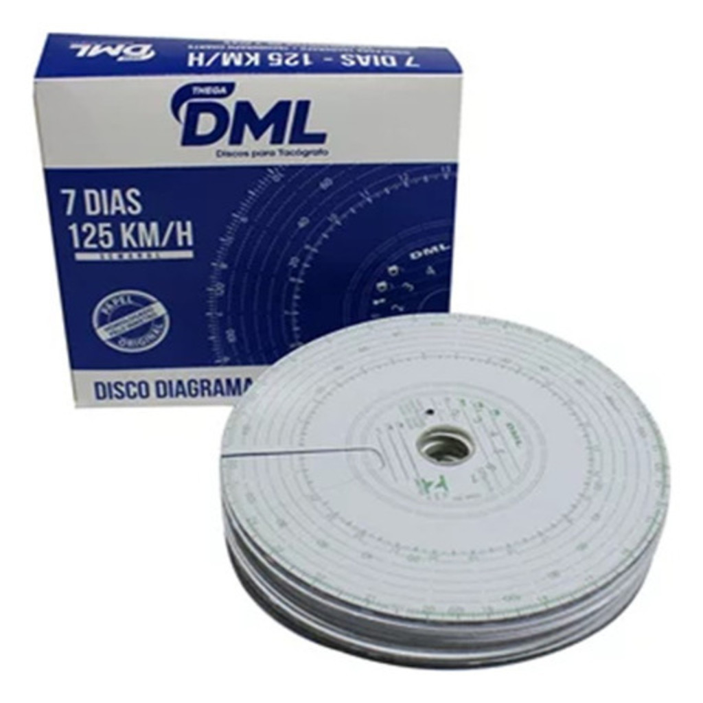 60 X Disco Tacógrafo Semanal 125x7d (caixa com 10 Unidades) Especificações Técnicas: - Material: Papel homologado pelo INMETRO - Modelo Universal - Analógico - Marca: DML - Referência: DML-001 Discos de Tacógrafos DML001 - 125km/h Semanal - 125x7D Os discos diagramas para tacógrafos DML são projetados com tecnologia de ponta e obedecem aos padrões internacionais de qualidade. A DML possui a mais completa linha de discos para tacógrafos, produtos esses homologados pelo Inmetro através das Portarias 053, 054 e 109. Os discos DML não desprendem resíduos (não soltam pó), dessa maneira prolongam a vida útil do tacógrafo, não perdendo suas grafias em possíveis contatos com água, óleo ou graxa. Possuem alta resistência química, o que garante a durabilidade das gravações.