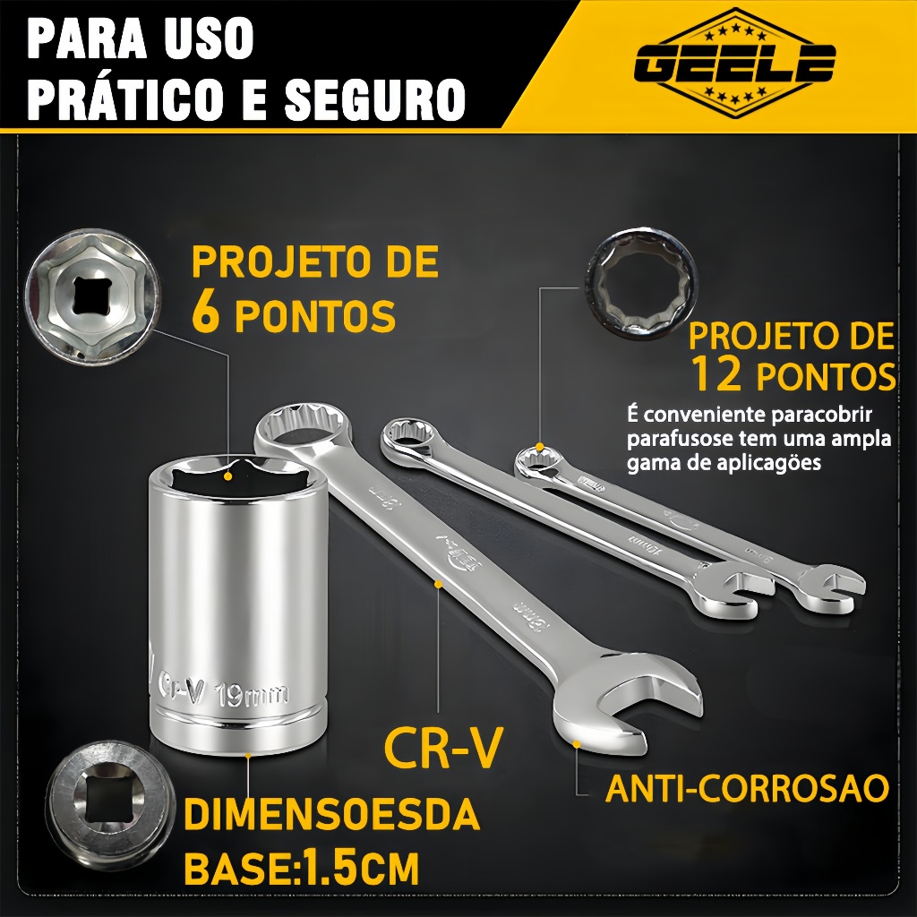 Conteúdo da embalagem: KIT1:61PCS Jogo de chaves e soquetes 1/2" e 1/4" 12 - Chaves combinadas 8-9-10-11-12-13-14-15-16-17-18-19mm 18 - Soquetes 1/2": 10-11-12-13-14-15-16-17-18-19-20-21-22-23-24-27-30-32mm 01 - Chave catraca 1/2" 02 - Extensão cabo T 12" 250mm 01 - Extensão 1/2" 125mm 01 - Cabo T 1/2" 01 - Junta universal 1/2" 02 - Soquetes 1/2" para vela 16-21mm 13 - Soquetes 1/4": 4-4,5-5-5,5-6-7-8-9-10-11-12-13-14mm 01 - Chave reta 1/4" 01 - Chave catraca 1/4" 01 - Extensão 1/4" 100mm 01 - Extensão 1/4" 50mm 01 - Extensão flexível 1/4" 01 - Cabo T 1/4" 01 - Junta universal 1/4" 03 - Chave Allen Hexagonal: 1-1,5-2mm 01 - Caixa de ferramentas Informações técnicas: - Dimensões da maleta: 38x8x28cm - Composição/Material: Cromo Vanádio e Plastico injetado rígido - Peso do kit: 5.7Kg 94PCS: - Conjunto catraca 94 peças + 1 Maleta Ultra Resistente; - 13 Soquetes em milimetros 1/4": 4mm, 4,5mm, 5mm, 5,5mm, 6mm, 7mm, 8mm, 9mm, 10mm, 11mm, 11mm, 12mm e 13mm. - 8 Soquetes em milimetros 1/4": 6mm, 7mm, 8mm, 8mm, 9mm, 10mm, 11mm, 12mm e 13mm. - 2 Barras extensoras 1/4": 2" e 4". - 1 Soquete junta universal (universal joint) 1/4". - 1 Catraca 1/4".- 1 Cabo giratório 6". - 17 Bits 1/4": SL 4; 5.5, 7; PH1,2 PZ1,2 HEX3,4,5,6,T8,10,15,20,25 e 30 - 1 Extensão flecivel 1/4": 6"- 1 Barra deslisante T 1/4"; - 1 Adaptador para bits. - 18 Soquetes em milímetros 1/2": 10mm, 11mm, 12mm, 13mm, 14mm, 15mm, 16mm, 17mm, 18mm, 19mm, 20mm, 21mm, 22mm,23mm, 24mm, 27mm, 30mm e 32mm. - 4 Soquetes 1/2": 14, 15, 17 e 19mm. - 2 Barras extensoras 1/2": 5" e 10". - 2 Soquetes em milimetros 1/2": 16 e 21mm. - 1 Soquete junta universal (universal joint) 1/2". - 1 Catraca 1/2".- 1 Suporte de bits. - 1 Adaptador.- 15 Bits (30L): SL8,10,12 T40,45,50,55 PH3,4 PZ3,4 HEX8,10,12 e 14. - 3 Chaves HEX em milimetros: 1.5,2,2.5mm. • Material: Aço carbono. • Dimensões: Estojo: Altura: 8 cm Largura: 27,5 cm Comprimento: 38,5 cm Garantia: 3 meses vendedor 121PCS: Contém: 10 – Soquetes 1/4: 4-5-6-7-8-9-10-11-12-13mm 04 – Soquetes Longos 1/4: 8-9-10-12mm 01 – Chave Catraca 1/4 01 – Extensão 1/4: 2" 01 – Junta Universal 1/4" 01 – Adaptador para Bits 1/4 01 – Chave Reta 1/4 03 – Soquete Bits 1/4: Fd4-5.5-6.5mm 02 – Soquete Bits 1/4: Ph1-2 02 – Soquete Bits 1/4: Pz1-2 04 – Soquete Bits 1/4: Hw3-4-5-6mm 07 – Soquete Torx Macho 1/4: T10-15-20-25-27-30-40 11 – Soquete 3/8: 9-10-11-12-13-14-15-16-17-18-19mm 04 – Soquete Longo 3/8": 13-14-15-17mm 02 – Soquetes para Vela de Ignição :16-21mm 08 – Soquete Torx Femea 3/8: E8-e10-e11-e12-e14-e16-e18-e20 02 – Soquetes Bits 3/8": Fd5.5-6.5mm 02 – Soquetes Bits 3/8": Ph1-ph2 02 – Soquetes Bits 3/8": Pz1-pz2 04 – Soquetes Bits 3/8": Hw3-4-5-6mm 07 – Soquetes Torx Macho 3/8": Tx20-30-40-45-50-55-60 01 – Chave Catraca 3/8" 02 – Extensão 3/8": 3"-6" 01 – Junta Universal 3/8 07 – Soquetes 1/2: 20-21-22-24-27-30-32mm 01 – Chave Catraca 1/2 02 – Extensão 1/2: 5"-10" 01 – Junta Universal 1/2 11 – Chaves Combinadas: 8-9-10-11-12-13-14-16-17-18-19mm 01 – Adaptador 3/8'fx1/4"m 01 – Adaptador 3/8'fx1/2"m 01 – Saca Filtro de Óleo 63-102mm 01 – Soquete Torx Macho: T-52 01 – Chave Teste 6v/12v24v 09 – Chaves Allen Hexagonal: 1.5-2-2.5-3-4-5-6-8-10mm 02 – Chaves de Fenda 6x100mm e Phillips 6x100mm (P)2x100mm 01 – Caixa de Ferramentas 151PCS: Conteúdo da embalagem: 13 – Soquetes 1/4: 4-4.5-5-5.5-6-7-8-9-10-11-12-13-14mm 06 – Soquetes Longos 1/4: 4-5-6-7-8-9mm 05 – Soquete Bits Torx Femea 1/4: E4-e5-e6-e7-e8 01 – Chave Reta 1/4 02 – Pçs: Extensão 1/4"- 2"- 4" 01 – Junta Universal 1/4" 01 – Adaptador para Bits 1/4" 01 – Chave Catraca 1/4" 01 – Cabo t 1/4" 10 – Bits 1/4: T10-t15-t20-t25-t27-t30-t40-ph1-ph2-fd5.5 11 – Soquete 3/8: 9-10-11-12-13-14-15-16-17-18-19mm 06 – Soquete Longo 3/8: 10-11-12-13-14-15mm 06 – Soquete Bits Torx Femea 3/8": E10-e11-e12-e14-e16-e18 03 – Soquete Bits 3/8": Fd4-5.5-6.5mm 03 – Soquete Bits 3/8": Ph1-ph2-ph3 03 – Soquete Bits 3/8": Pz1-pz2-pz3 04 – Soquete Bits 3/8": Hw3-4-5-6mm 07 – Soquete Bits Torx Macho 3/8": Tx20-30-40-45-50-55-60 01 – Chave Catraca 3/8" 02 – Extensão 3/8: 3"-6" 02 – Soquete para Vela de Ignição 3/8 : 16-21mm 01 – Junta Universal 3/8 17 – Soquete 1/2: 10-11-12-13-14-15-16-17-18-19-20-21-22-24-27-30-32mm 01 – Adaptador 3/8"fx1/2"m 06 – Soquete Longo 1/2: 10-12-13-14-17-19mm 03 – Soquete Torx Femea 1/2: E20-e22-e24 04 – Soquetes Impacto 1/2: 17-19-21-23mm 01 – Chave Catraca 1/2" 02 – Extensão 1/2: 5"-10" 01 – Junta Universal 1/2 12 – Chaves Combinadas: 8-9-10-11-12-13-14-15-16-17-18-19mm 03 – Chaves Catracas: 8x10-12x13-17x19mm 09 – Chaves Allen Hexagonal: 1.5-2-2.5--3-4-5-6-8-10mm 01 – Caixa de Ferramentas Informações técnicas: - Dimensões da maleta: 35x9x46cm - Composição/Material: Cromo Vanádio e Plastico ingetado rígido - Peso do kit: 8.1Kg 172PCS: Outras características Quantidade de peças: 172 Comprimento mínimo da chave - Comprimento máximo da chave: 4 mm - 180 mm Material: Aço cromo-vanádio Inclui estojo: Sim Para situações de aperto manual Adaptador quadrado conforme DIN 3120,