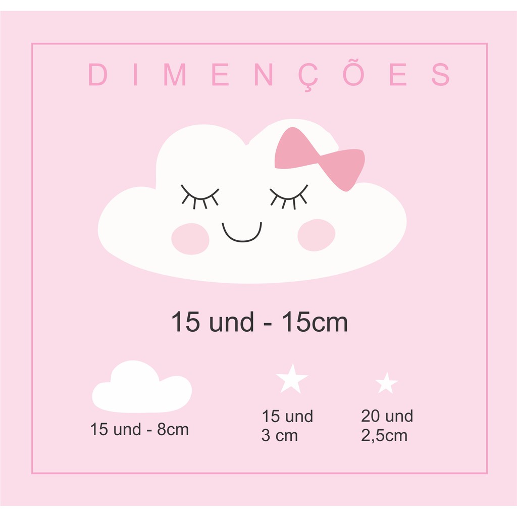 INFORMAÇÕES DO PRODUTO: 15 NUVEM: 15 cm 15 NUVEM: 8 cm 15 ESTRELAS: 3 cm 20 ESTRELAS: 2,5 cm - Produto auto-colante, não necessita de cola; - Adesivo impresso em vinil de alta qualidade, próprio para decoração; - Não possui cheiro e não é tóxico. Quais são as vantagens? - Renove seus ambientes quando quiser, sem bagunça, sem pedreiros, sem pintores. - Não deixa resquícios de cola ao ser removido; - Material de qualidade superior, garantindo durabilidade média de 5 anos em ambientes fechados. Onde posso aplicar? - Portas - Paredes lisas - Vidros e espelhos - Box de banheiro (lado de fora) - Móveis