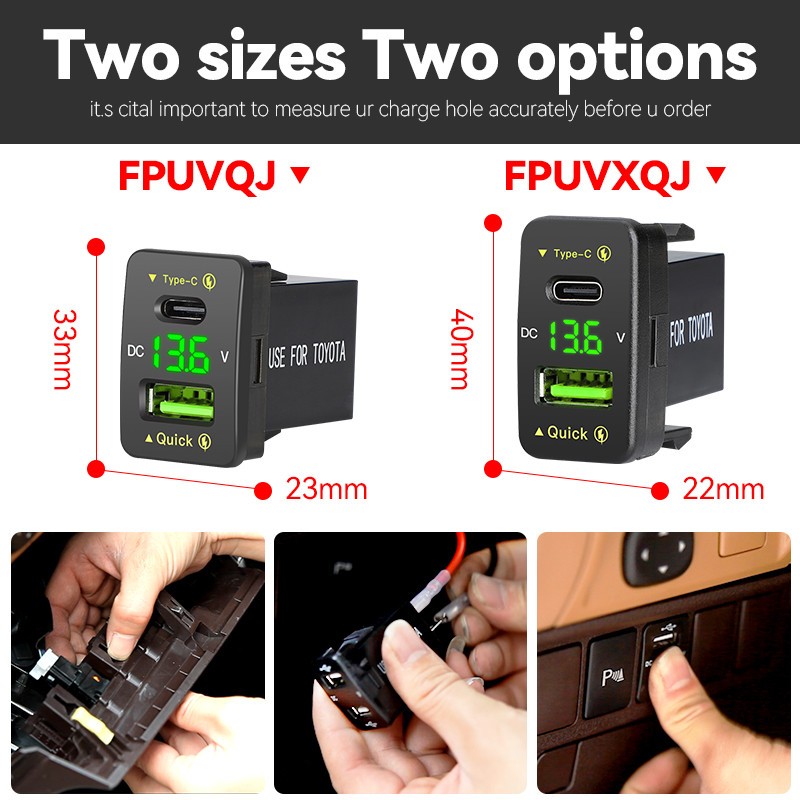 🔺 Dois tamanhos, duas opções: ①23 x33mm ≈0.9x1.3polegadas ②22 x40mm ≈0.87x1.57polegadas 🚗Loja Oficial YouLiang🚗 -Fabricante profissional de 15 anos✔️ -Envie dentro de 24 horas em dias úteis🚛 -Com CE e,Rohs e outros cetificados✔️ 【Especificação】 🌞Material: PC 🌞Tensão de Entrada: DC 12V-24V 🌞Saída máxima de saída máxima: PD 30W / QC 36W 🌞Cor vermelha, Verde,Azul 【DESIGN DE PORTA DUAL】 ⭐Porta de carga rápida e design de porta tipo C PD, pode carregar dois dispositivos diferentes simultaneamente, permitindo compartilhar o tempo de carga rápido e o design da porta tipo C PD, pode carregar dois dispositivos diferentes simultaneamente, permitindo que você compartilhe o tempo de carga com outras pessoas. 【Voltímetro Digital】 ⭐A tensão precisa em tempo real mostra a tensão precisa em tempo real. A leitura do medidor de tensão led aparecerá após o item ser conectado à bateria. 【Excelência da embalagem】 ⭐Escolhemos cuidadosamente excelentes materiais de embalagem que são resistentes, confiáveis e impermeáveis, com no mínimo 3 camadas de embalagem para cada produto, apenas para obter o produto à sua frente melhor e dar-lhe o melhor resultado possível Por muito tempo de espera. 【Ampla Compatibilidade】 ⭐Compatível com todos os dispositivos alimentados por USB, telefones Android, iPhone, Samsung Galaxy, Google Pixel, Macbook, tablets, notebook, GPS, câmeras digitais, controladores de videogames e outros dispositivos automáticos. 【O que você receberá】 Carregador de soquete USB de carro com cabo✔️ Aviso: O carregador USB Tipo-C extra, mas não é compatível com tudo para substituição ou carregador USB Tipo-C extra em para TOYOTA, mas não é compatível com todos para carros TOYOTA ★Comparado com outros produtos, eles usam apenas um chip de carregamento rápido, que não carrega rapidamente ao mesmo tempo, ou mesmo um chip de carregamento rápido, que não carrega rapidamente ao mesmo tempo, ou mesmo um chip de carregamento rápido de baixa qualidade. Nossos produtos usam dois chips de carregamento rápido de alta qualidade, que podem carregar rapidamente dois telefones ao mesmo tempo e durar mais. ‼️O produto é fabricado para caber no espaço OEM Disponível em seu carro ou caminhão, funciona ótimo como reposição ou carregador USB extra duplo em TOYOTA, Mas não é compatível com todos os carros TOYOTA, (Países diferentes, O tamanho do furo pré-perfurado do carro é diferente ano de produção do carro, o tamanho do furo pré-perfurado do carregador do carro varia. Geralmente, tamanho 23x33mm 0,9x1,3inch para carros Toyota feitos após 2013. Modelos Toyota do tamanho 22x40mm 0,87x1,57inch para alguns modelos Toyota mais velhos..)Verifique a dimensão do item e o slot do seu veículo para garantir que se encaixe antes de fazer um pedido. 【NÓTICO】 1) Por favor, adicione este item ao seu carrinho ou adicionado à lista de desejos para que você possa receber a atualização de preços sobre isso via e-mail✉️ 2) Se você gosta de nossos produtos, dê-nos um bom feedback com fotos para que mais compradores possam ser usados como referência📸 3) Por favor, permita a diferença de 1-3mm por causa da medição manual. ⚠️Se você encontrar o produto não funciona após a instalação, verifique se há algumas condições: 1.Os pólos positivos e negativos são revertidos? 2. O fusível é o fusível na fiação soprado? 3.Se a fonte de alimentação está com falta de eletricidade? 4.A leitura do medidor de tensão led aparecerá após o item ser conectado à bateria. Ficar à vontade para nos informar se houver um problema defeituoso com o produto, responderemos online dentro de 24 horas!