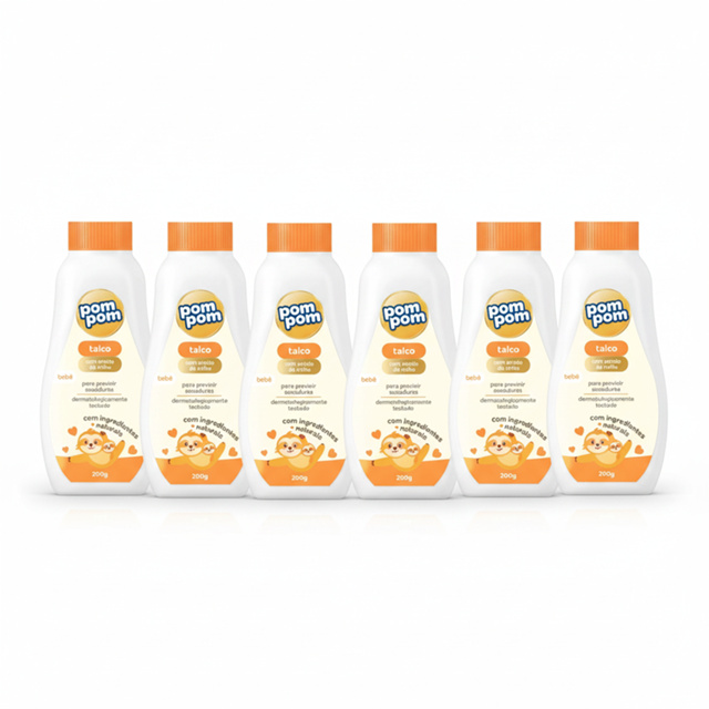 Kit com 6 Talcos Infantil Pom Pom 200g O novo Talco Pom Pom protege a pele do bebê contra o atrito e a umidade, que podem causar assaduras e irritações. Feito com amido de milho, garante suavidade e maciez à pele. Coloque o talco nas mãos e espalhe suavemente sobre a pele limpa e seca do bebê, evitando contato com os olhos, boca e a inalação do produto. Composição: Amido de Zea Mays, Talco, Fragrância, Etilexilglicerina, Água, Glicerina, Extrato da Semente de Gossypium Herbaceum, Sorbato de Potássio, Benzoato de Sódio, Cumarina, Citronelol, Geraniol, Alfa-Isometil Ionona, Butilfenil Metilpropional, Álcool Cinamílico.
