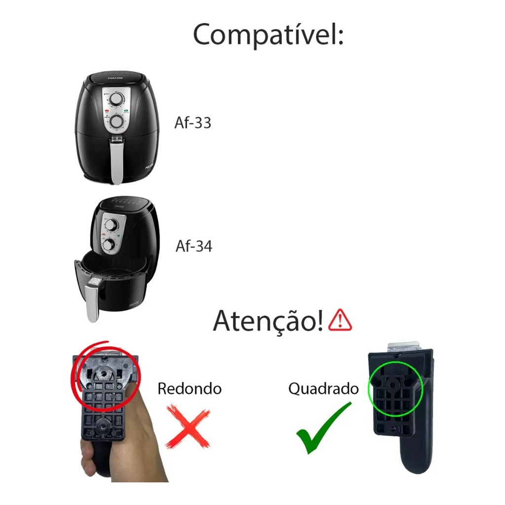 🚨NÃO É COMPATÍVEL COM A LINHA NAF - LEIAM A DESCRIÇÃO 🚨 ❗ EVITE ERROS NA COMPRA! TIRE TODAS AS SUAS DÚVIDAS NO CHAT ANTES DE FINALIZAR O PEDIDO. ❗ 🚨 IMPORTANTE: PERGUNTE ANTES DE COMPRAR PARA ESCOLHER O MODELO CORRETO! 🚨🔧 PUXADOR AIR FRYER COMPATÍVEL PARA MONDIAL Af33 Af34 Resistência e Encaixe Perfeito O puxador Mebrasi é a peça ideal para substituir o puxador danificado da sua Air Fryer Mondial. Projetado para encaixe perfeito, oferece resistência, segurança e praticidade no uso diário, mantendo sua fritadeira em ótimo funcionamento. 🔥 Alta durabilidade: produzido com materiais resistentes ao calor, garantindo maior vida útil. 💡 Fácil instalação: não precisa de assistência técnica. ✅ Compatibilidade garantida: exclusivo para modelos Mondial Af33 Af34 e MODELO AF-UT - 01 - Air Fryer ultra 3,2l Especificações do produto: Cabo em Nylon resistente ao calor Suporte do cesto em Nylon reforçado Moldura em ABS de alta qualidade Botão acionador em Policarbonato Trava da bandeja, pino e mola em Aço Inox Parafuso em Aço zincado 👉 Escolha o puxador Mebrasi e tenha sua Air Fryer sempre pronta para uso, com segurança e qualidade garantida.