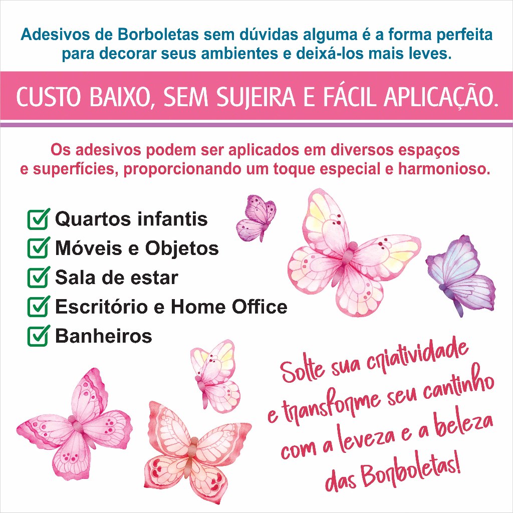 Bem Vindo a Star Stickers Encante Seu Ambiente com Adesivos de Borboletas. Se você deseja transformar sua decoração de forma simples, elegante e cheia de personalidade, os adesivos de borboletas são a escolha perfeita! Com suas formas delicadas e cores vibrantes, eles trazem movimento e leveza para qualquer ambiente, criando um efeito visual incrível. Esses adesivos adicionam um charme especial sem a necessidade de reformas ou gastos excessivos. Nosso material é fabricado em vinil (ADESIVO) de qualidade (não é papel, é plástico) Maior APARÊNCIA e DURABILIDADE. Recortados eletronicamente, só destacar e colar. Tamanho e quantidade das borboletas nas fotos do anúncio. Verifique a quantidade que precisa e aproveite os descontos. P: Se pegar água ou sol estraga? R: Pode molhar que não desbota nem descola. P: Precisa fazer a limpeza no local de aplicação? R: Sim, instruções no final da discrição. P: Precisa de técnica para aplicação? R: Não, é super fácil de aplicar (apenas se atente ao posicionamento correto onde será aplicado). P: Os adesivos já vem cortado? R: Sim, é só destacar e colar. DICA DE LIMPEZA DO LOCAL DE APLICAÇÃO! Limpeza: Primeiro faça uma limpeza completa na área onde serão aplicados os adesivos (superfície precisa ser lisa), para que a mesma fique livre de qualquer tipo de impureza, tais como: poeira, óleo, graxa, cera, silicone, etc. Não encere. Boas compras! Muito obrigado pela visita.