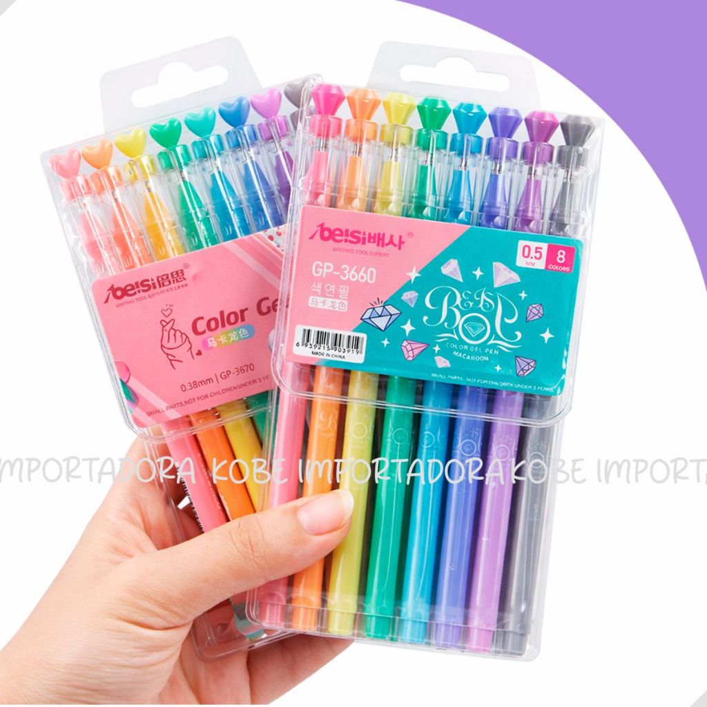 Kit com 8 canetas gel coloridas em delicados tons pastel, perfeitas para deixar seus estudos e anotações ainda mais bonitos. Possuem ponta fininha de 0.5mm e 0.38mm, ideais para escrita detalhada, lettering, planners e desenhos. A tampa conta com ponta decorada em formato de coração ou diamante, trazendo um toque fofo e elegante. Possuem grip para prender no caderno ou estojo, garantindo mais praticidade no dia a dia. Escrita suave, traço preciso e acabamento encantador para quem ama papelaria criativa. -8 Canetas de Gel -Ponta Coração: 0.38mm -Ponta Diamante: 0.5mm